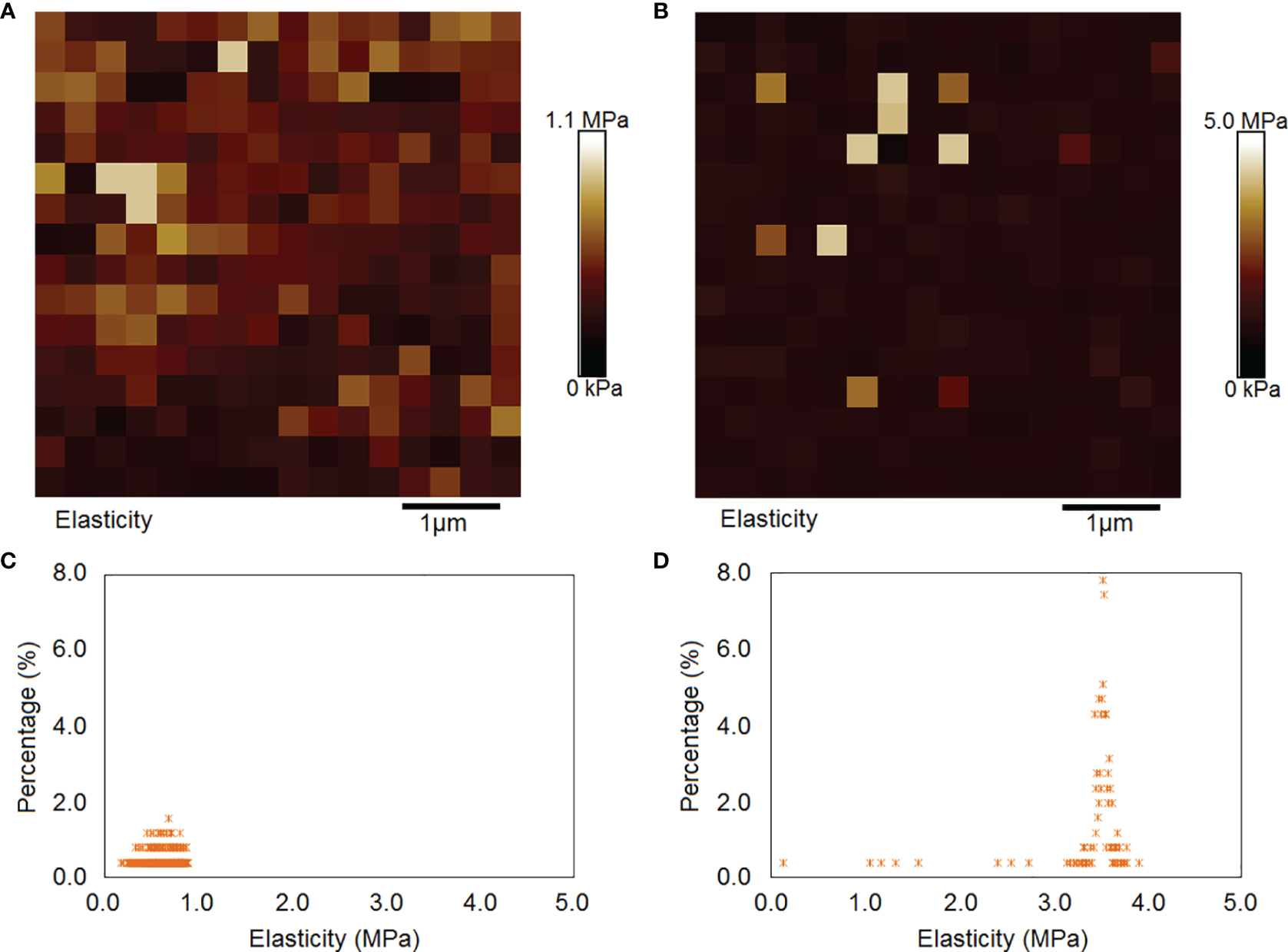 Comparison of the cell surface elastic modulus of P. donghaiense.(A, C) The normal culture conditions. (B, D) The nitrogen limiting conditions.