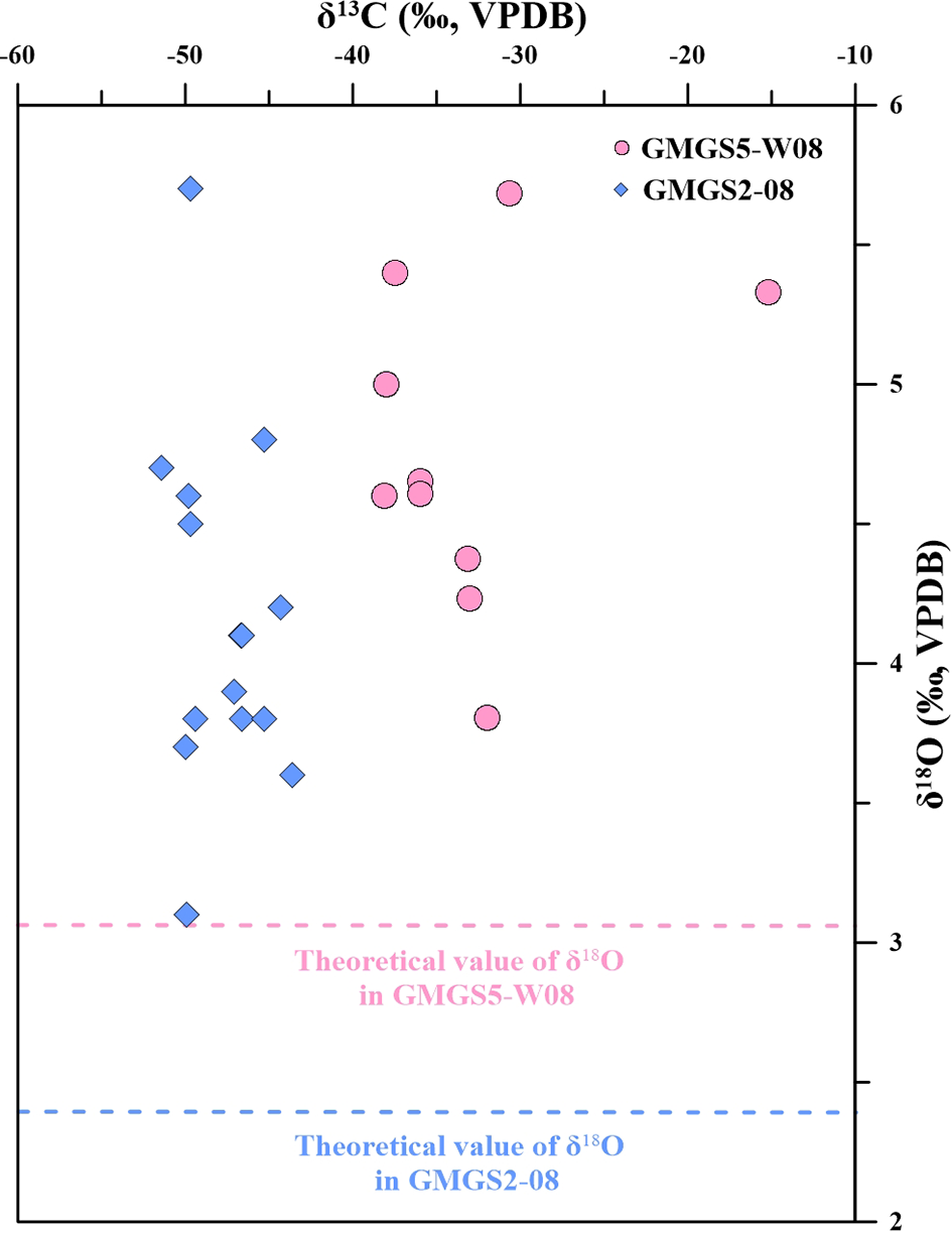 Plots of carbon vs. oxygen stable isotope values. The data of GMGS2-08 from Chen et al., 2019.