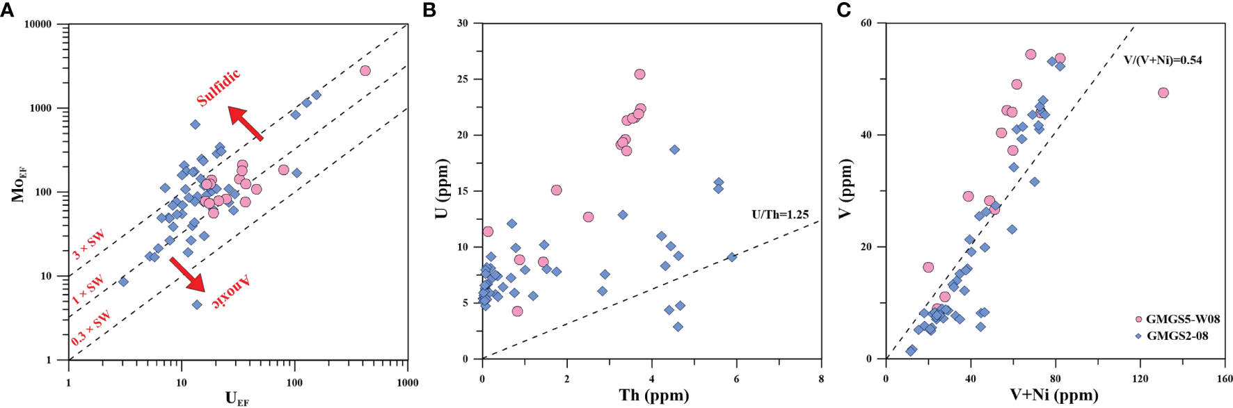 (A) Plots of MoEF vs. UEF of the seep carbonates from the sites GMGS5-W08 and GMGS2-08 (from Deng et al., 2020) taken from the South China Sea (see Figure 1). Samples were normalized by the standard Post Archean Australian Shale (PAAS) (Taylor and McLennan, 1985). The diagonal lines represent multiples of the Mo:U weight ratio of present-day sea water (SW) and were taken from Algeo and Tribovillard (2009). (B) Plots of U vs. Th contents of the seep carbonates. The diagonal line represents U:Th =1.25 and was taken from Jones and Manning (1994). (C) Plots of V vs. (V+Ni) contents of the seep carbonates. The diagonal line represent V: (V+Ni) = 0.54 and was taken from Jones and Manning (1994).