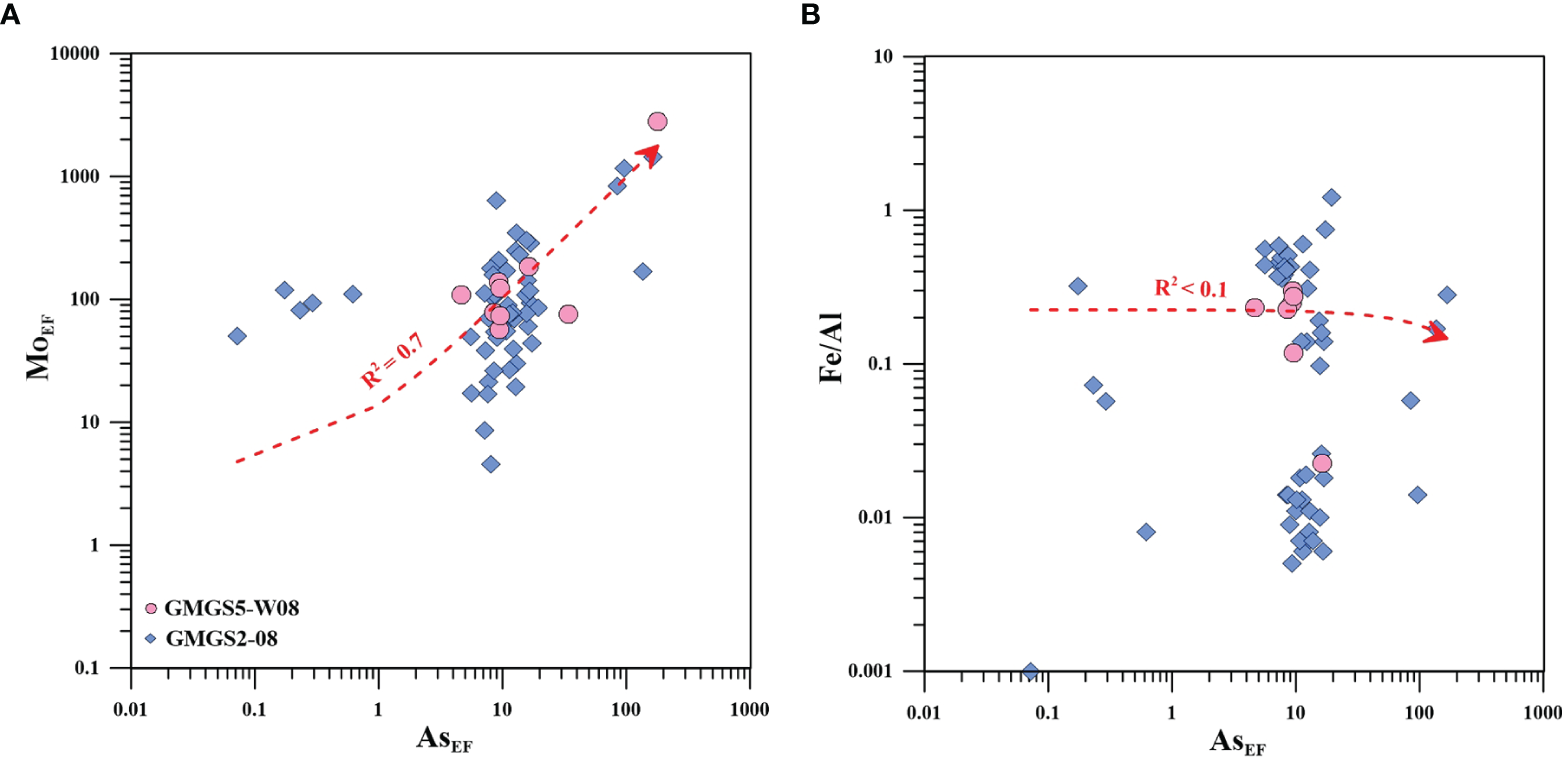 The enrichment factor (EF) was calculated as XEF = [(X/Al)sample/(X/Al)PAAS], where X and Al represent the weight concentrations of elements X and Al, respectively. The samples were normalized using the Post Archean Australian Shale (PAAS) composition (Taylor and McLennan, 1985). By calculation, the Mo enrichment factors (EF) in GMGS5-W08 seep carbonate vary from 56.4 to 2710.0 (average 278.9, n= 16) (Figure 3A). The U enrichment factors in GMGS5-W08 seep carbonate vary from 16.3 to 407.9 (average 53.1, n= 16) (Figure 3A). The overall range of U/Th ratio is 5.08 to 86.87 (average 11.37, n= 16) (Figure 3B). The overall range of V/(V+Ni) ratio is 0.36 to 0.82 (average 0.63, n= 16) (Figure 3C).
