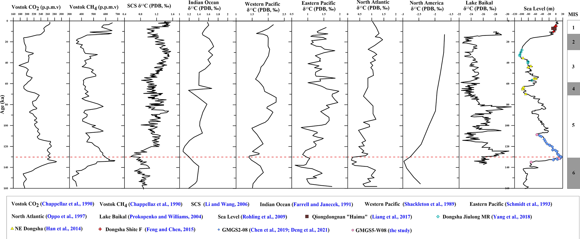 Many marine and terrestrial sedimentary records of carbon isotopes indicate obvious negative excursion during the penultimate deglaciation (~130 ka). These records have been collected from regions such as the East Pacific (Shackleton and Hall, 1989), the Western Pacific (Schmidt et al., 1993), the northern Atlantic (Oppo et al., 1997), the South China Sea (Li and Wang, 2006), the Indian Ocean (Farrell and Janecek, 1991), Lake Baikal (Chappellaz et al., 1990), North America (Coplen et al., 1994), and Europe (Frogley et al., 1999). In addition, an ice core taken from Vostok recorded a rapid increase in global atmospheric methane and carbon dioxide levels during that time (Chappellaz et al., 1990), indicating the release of a large quantity of methane into the atmosphere during this period. Many people believe that the methane might originate from the increased vegetation (Coplen et al., 1994; Li and Wang, 2006; Häuselmann et al., 2015) or the extended wetlands, peatlands, and inundated floodplains (Chappellaz et al., 1990; Lourantou et al., 2010; Bock et al., 2017; Schmidely et al., 2021) in deglaciation times. However, most studies in recent years have shown that the release of methane from gas hydrates has a significant impact on climate change (Kennett et al., 2000; Shakhova et al., 2010; Berndt et al., 2014), including in polar regions (Serov et al., 2017) and other deep-sea areas (Reagan and Moridis, 2007; Foschi et al., 2020). Therefore, from the perspective of methane seepage, we believe that a large amount of methane from hydrate dissociation contributes to climate change. Some obvious directions of related future research include discussing the driver of negative excursion of global carbon isotopes, and identifying the link to the massive global dissociation of natural gas hydrate.