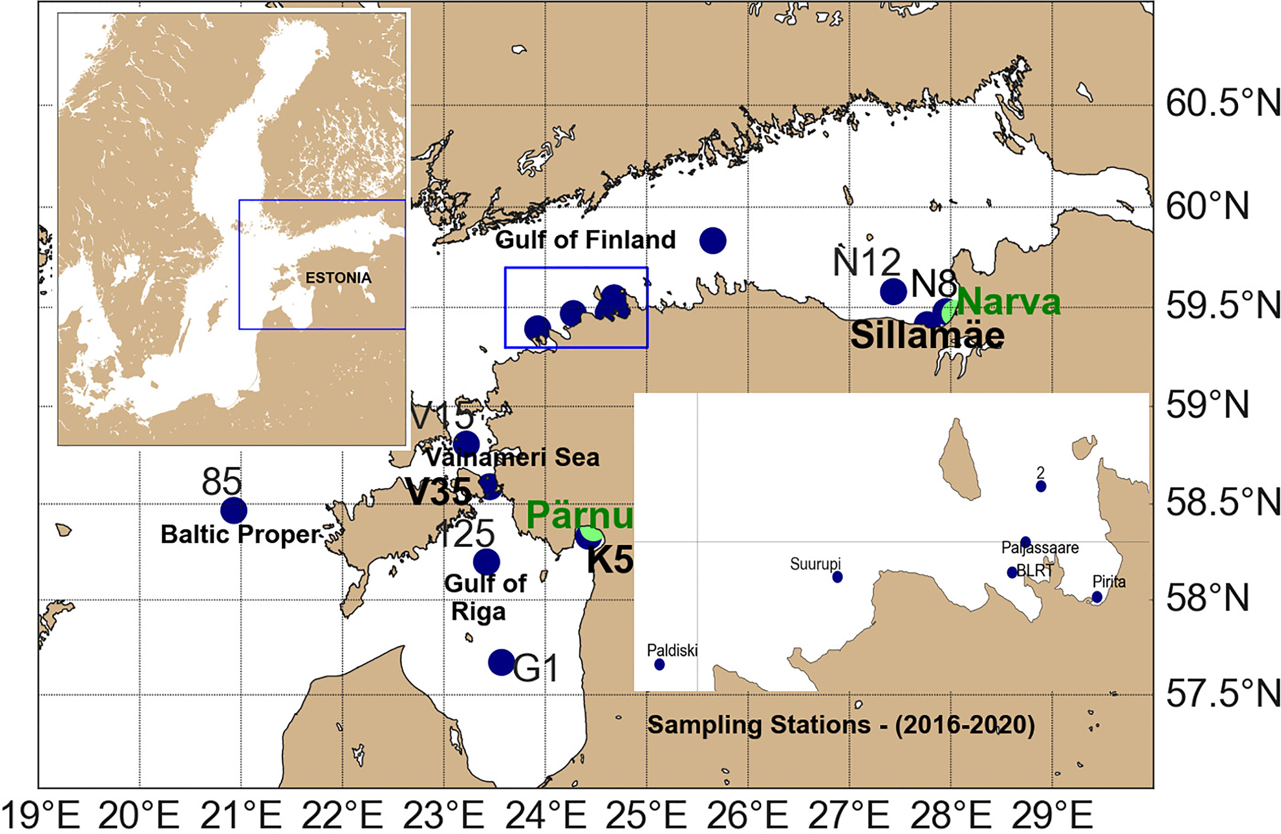 In total, 16 sampling stations were visited in the western Gulf of Finland (GOFW), eastern Gulf of Finland (GOFE), central Gulf of Finland (GOFC), GOR, VS, and northern BP (Figure 1). Stations in the GOFW and GOFE were quite close to shore, while stations in the BP, GOFC, and GOR (excluding Station K5) were offshore. The station network was not the same each year. Visited stations in different years are shown in Table 1. Sampling stations N8 (visited 15 times), 14 (15), Sillamäe (Sill) (14), Paljassaare (Pal) (13), 2 (12), and K5 (11) were sampled more than ten times during the 5-year period. The frequency of sampling times in other stations is as follows: V15 (6), V35 (6), 125 (5), N12 (4), G1 (3), Pirita (Pir) (2), Paldiski (Pald) (1), Suurupi (Suu) (1), and BLRT (1). Please note that station Pal is located close to the largest city wastewater treatment plant outfall in the study area, station N8 close to the Narva river mouth, and station K5 close to the Pärnu river mouth. The detailed observational periods at each sampling site are mentioned in Supplementary Table 1.