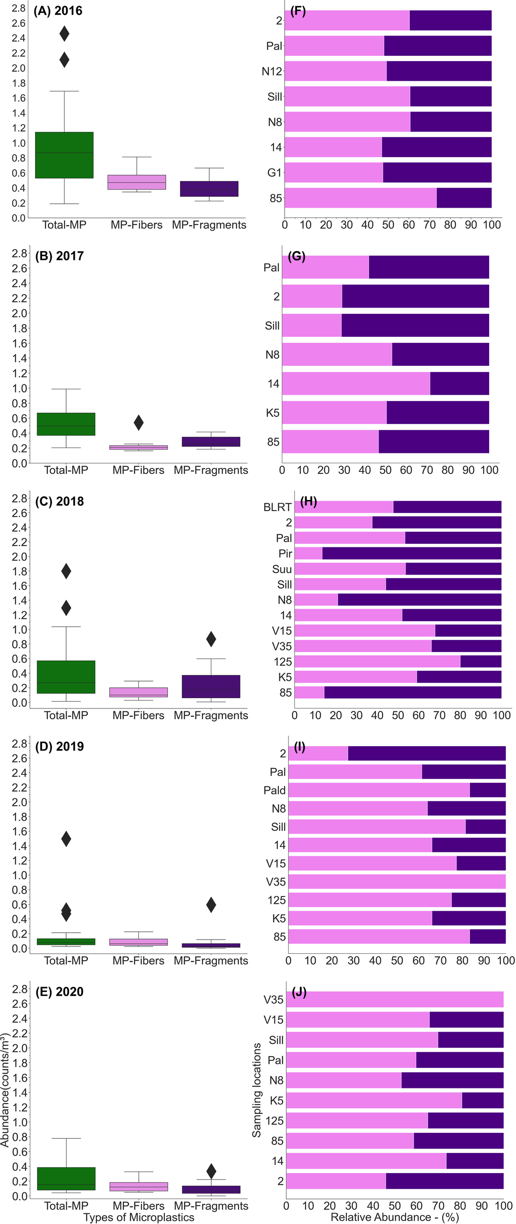 Average MP fiber counts/m3(A–F) and average MP fragment counts/m3(G–L) at each sampling station. The overall average for 2016–2020 was calculated as an arithmetic mean of all individual concentrations in the sampling location (F, L). The highest MP fiber and MP fragment concentration (counts/m3) at the sampling station is shown in parentheses (F, L).