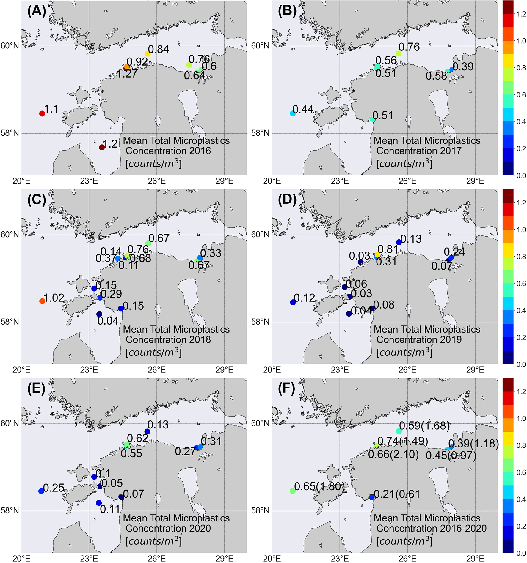 Relatively high annual mean MP concentrations (Figure 3; concentrations are shown if the station was visited more than once) were observed in 2016 (Figure 3A). The highest mean concentrations (>1.0 counts/m3) were observed in the GOR (station G1) and the BP (station 85) and at station Pal. Lower values were observed at the GOFE stations. Mean concentrations were in a quite narrow range (0.39–0.58 counts/m3) (0.07–0.1 counts/m2) in the whole area in 2017; only in the GOFC was the value higher (Figure 3B). The highest mean concentration (>1.0 counts/m3) was observed in the BP, while concentrations were 20-fold lower in the GOR and VS in 2018 (Figure 3C). Spatial distribution of the MP concentrations in the GOF had a large range, varying from 0.11 to 0.76 counts/m3 (0.02–0.13 counts/m2) (Figure 3C). Very low mean values (<0.08 counts/m3) were observed in the GOR and VS in 2019 (Figure 3D). Quite low values, except at station 2, were observed in the GOF and BP as well (Figure 3D). A similar pattern was observed in the study area in 2020 (Figure 3E).