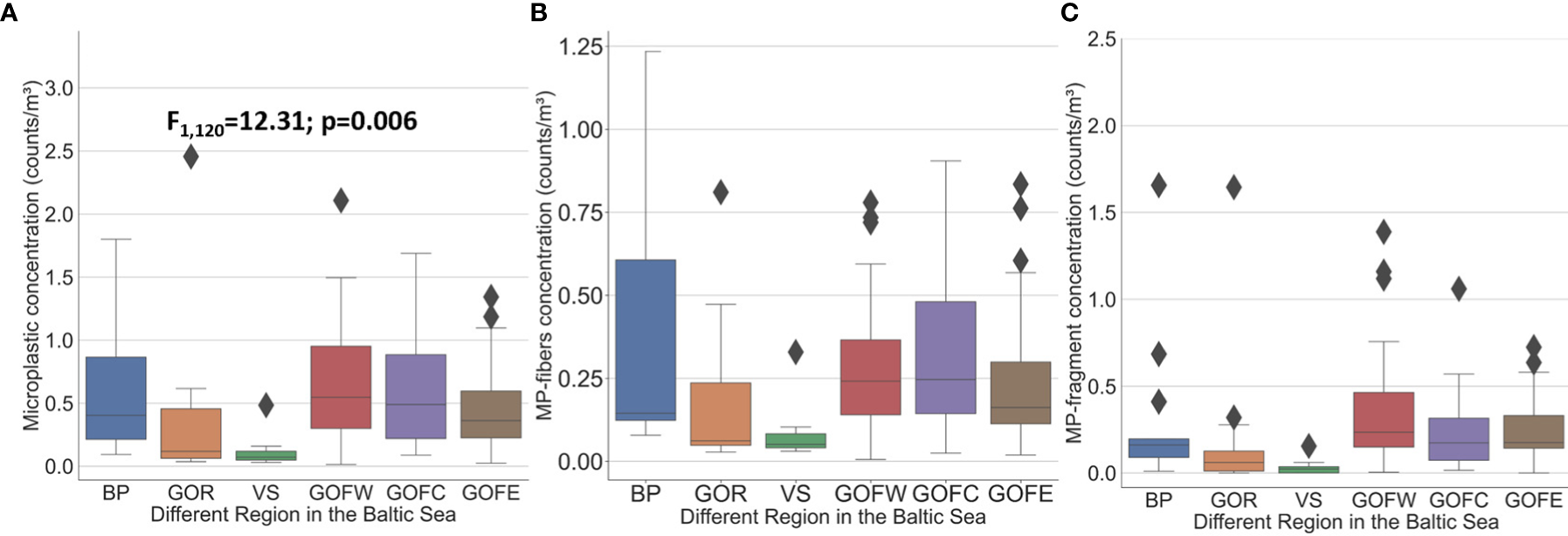 (A) The variability of MP concentrations in different regions of the eastern Baltic Sea in 2016–2020. (B) The variability of MP fiber concentrations in different regions of the eastern Baltic Sea in 2016–2020. (C) The variability of MP fragment concentrations in different regions of the eastern Baltic Sea in 2016-2020.