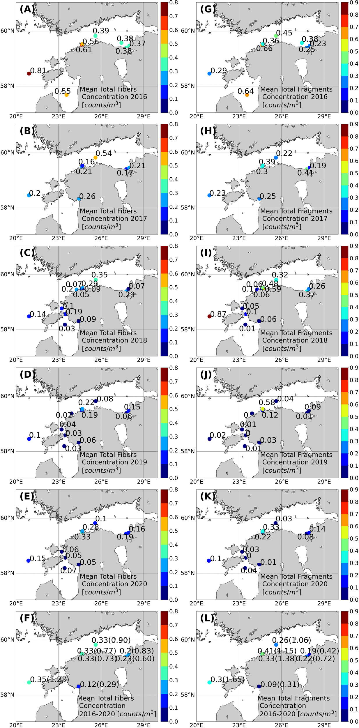 The mean share of fibers and fragments for the whole area in the 5 years was almost equal (Figure 2). The latter also roughly holds when considering the means of the regions (Figure 5). Thus, the mean spatial distribution of fibers and fragments taken separately (Figures 5A–F and Figures 5G–L) is similar to the total MP concentration (Figure 3F). This means 5-year mean concentrations of fibers and fragments in the vicinity of Pärnu and Narva river mouths are lower than at the open sea stations.