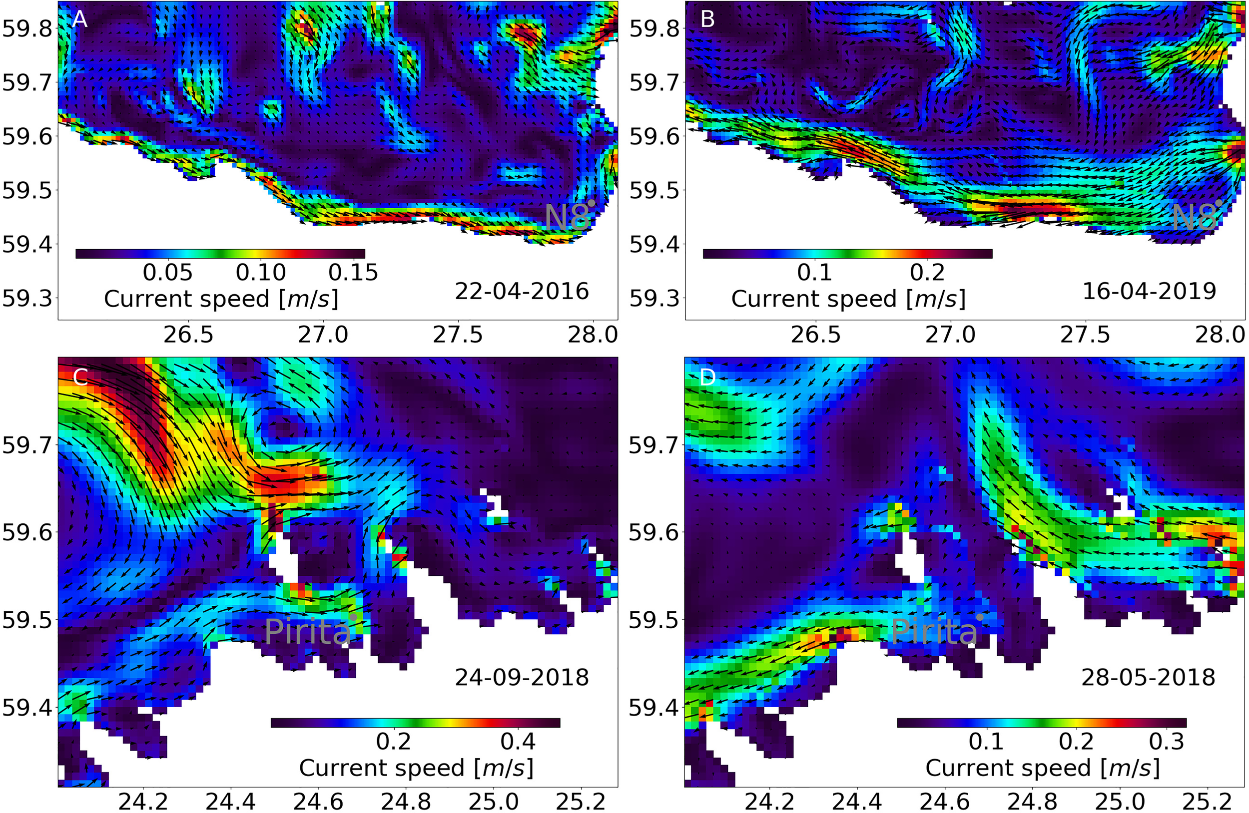 Mean surface current vectors and current speed averaged 3 days before observations of (A) highest concentrations at station N8, (B) lowest concentrations at station N8, (C) highest concentrations at station Pir, and (D) lowest concentrations at station Pir.