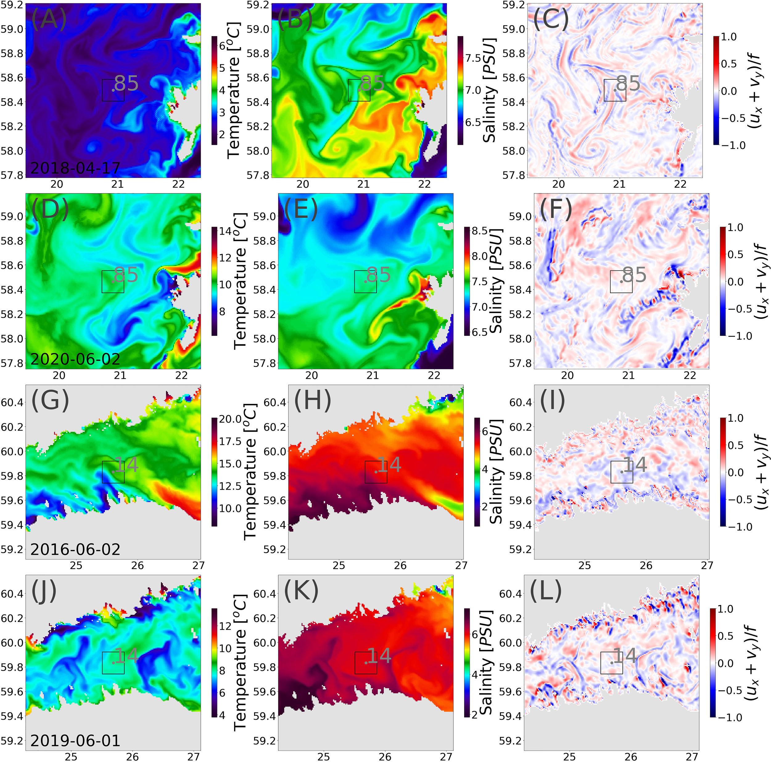 Snapshots of surface temperature (A, D, G, J), surface salinity (B, E, H, K), and current field divergence, ux+vy/f, in the surface layers (C, F, I, L) during the highest and lowest measured concentration of MPs at selected stations. The gray box indicates the location around measurement location with 10-km distance.