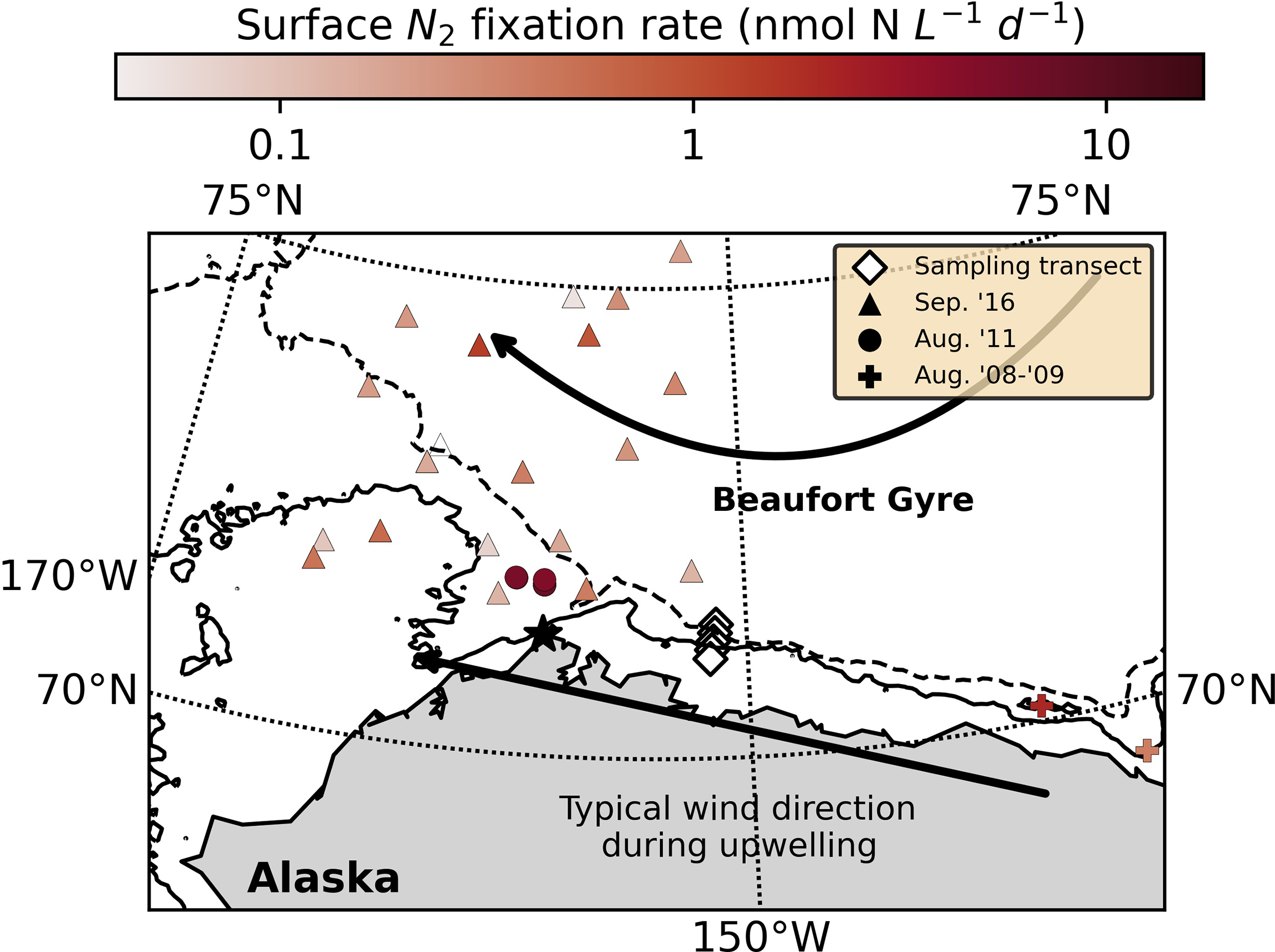 Station locations (diamonds) and N2 fixation rates (not associated with upwelling) measured in August 2008-2009 (crosses; Blais et al., 2012), August 2011 (circles; Sipler et al., 2017) and September 2016 (triangles; Harding et al., 2018). The solid and dashed lines indicate the 50 and 200 m isobaths, respectively (NOAA National Geophysical Data Center 2009; Jakobsson et al., 2012). The Beaufort Gyre is represented schematically by the curved arrow, and the direction of wind that typically induces upwelling is indicated by the straight arrow. Pt. Barrow is labeled with a star.