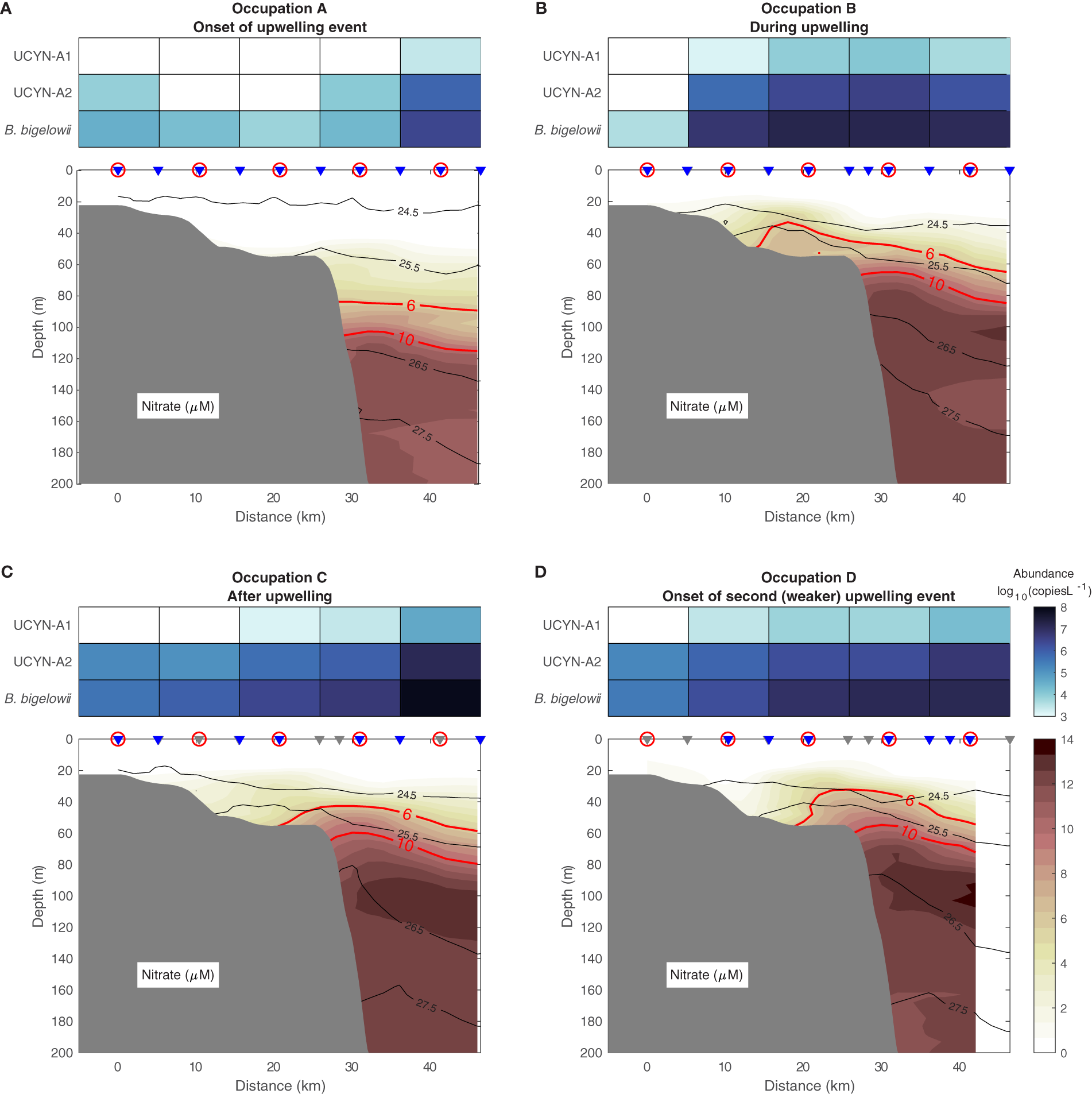 Cross-shelf nitrate concentrations, UCYN-A1 and UCYN-A2 nifH gene abundance, and B. bigelowii 18S rRNA abundance (log10(gene copies L-1)) at the onset of the upwelling event [August 30-31, (A)], during the event [September 1-2, (B)], after the event [September 3-4, (C)], and at the onset of a second, weaker upwelling event [September 5, (D)]. The isopycnals are contoured in black (kg m-3). The contours of 6 and 10 μM nitrate are highlighted in red. The grey triangles are CTD-only stations, the blue triangles are the stations where both CTD and nitrate data were measured, and the stations with gene and rRNA abundance measurements are circled. The bathymetry is from the International Bathymetric Chart of the Arctic Ocean version 3.0 (Jakobsson et al., 2012).