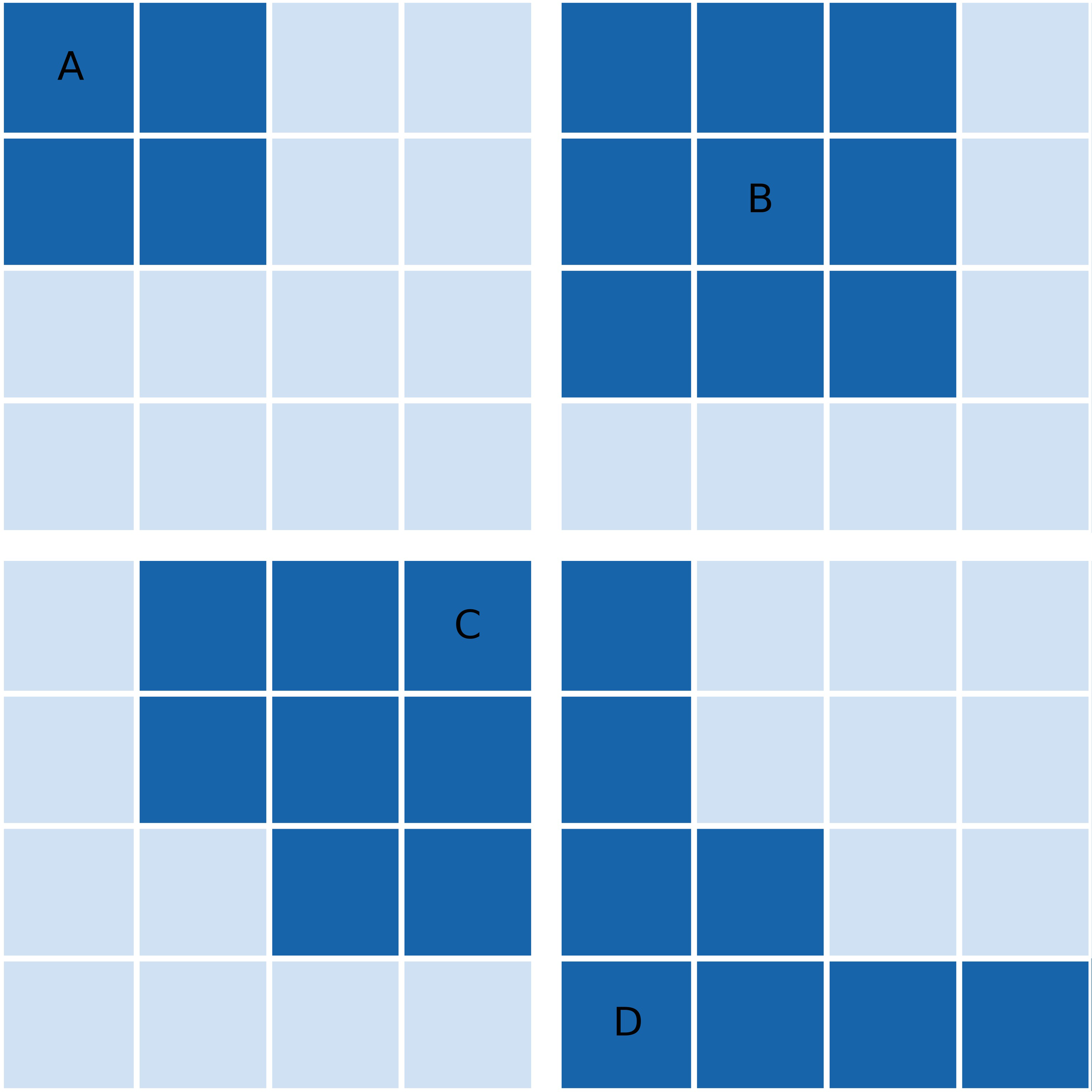 Demonstration of the set cover optimization problem for a set of 2D grid points (universe) and 4 subsets indicated by dark grid squares. Subsets are labelled (A–D). Of these four subsets, the greedy approximation algorithm would choose (B–D). After the reassignment step of the Modified Greedy Set Cover algorithm, (B) would be removed from the final solution as all of its points can be reassigned to (C, D).