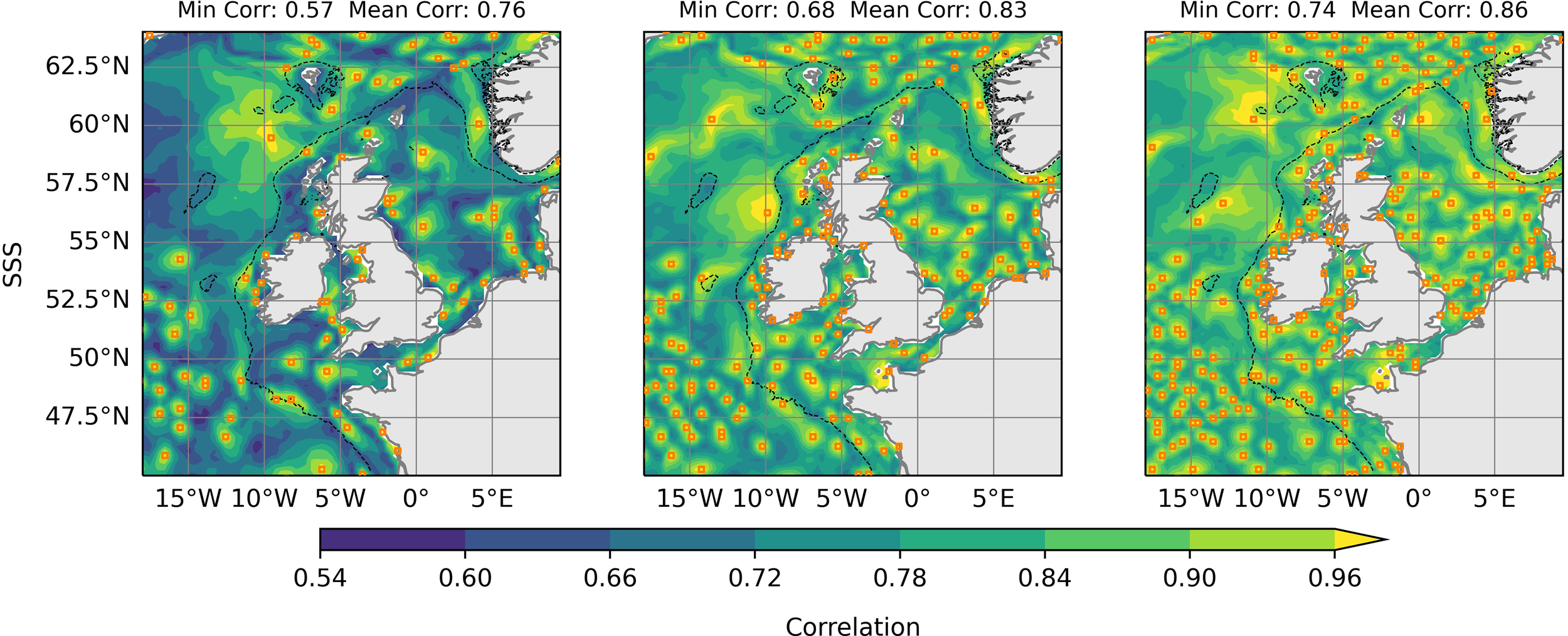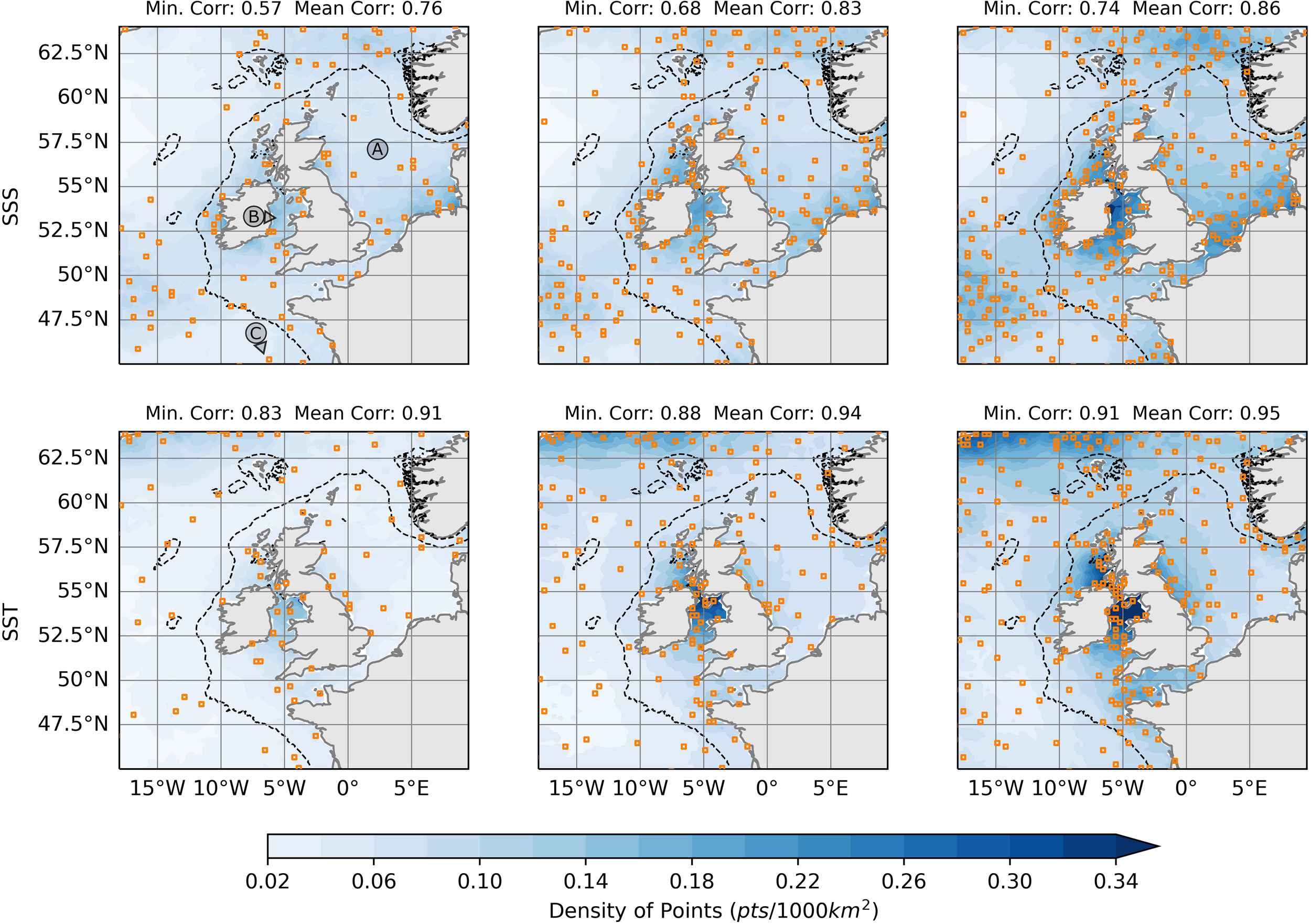 For SSS, areas of high point density are in coastal areas, especially in the Irish Sea and Southern North Sea. These are areas which are strongly influenced by river outflows and tidal flows, perhaps leading to more spatial variation at the surface. There are also two areas off shelf which have a higher density of points: in the Atlantic ocean southwest of Ireland and North of the Shetland Islands. These are areas subject to a relatively high eddy kinetic energy resulting from the tail end of Gulf Stream. We see many similar structures in SST, although there are also differences. Most notably, the density of points is greatly reduced in the southern North Sea and is increased in the Northwest of the domain. This figure also shows the minimum and mean absolute correlations achieved throughout the domain for each set of locations. We can see that as the number of points increases, so does the minimum and mean correlation for both SST and SSS. In all three cases SST obtains higher correlations than SSS, suggesting longer correlation length scales, possibly because it is strongly influenced by large scale atmospheric fluxes.