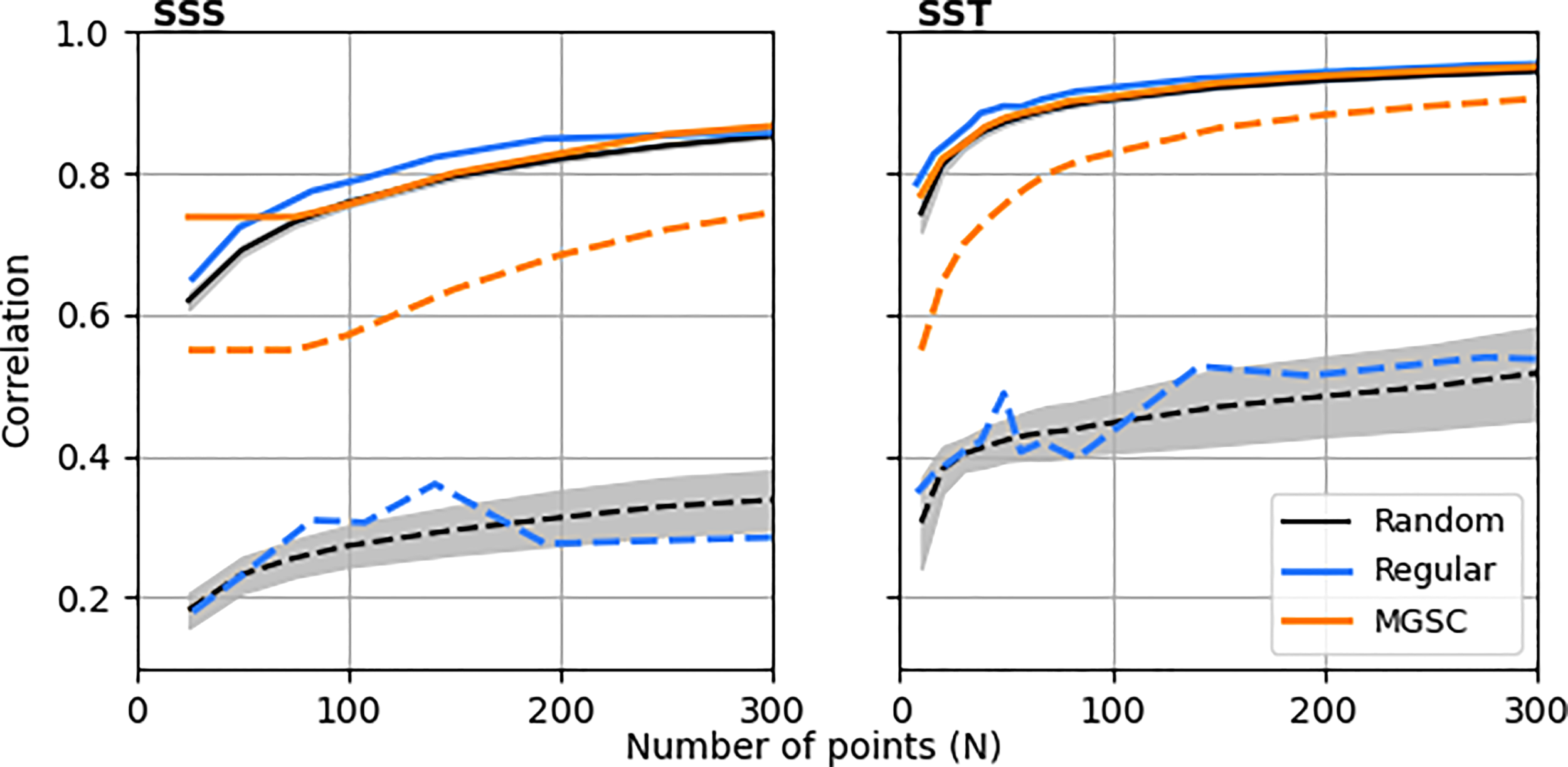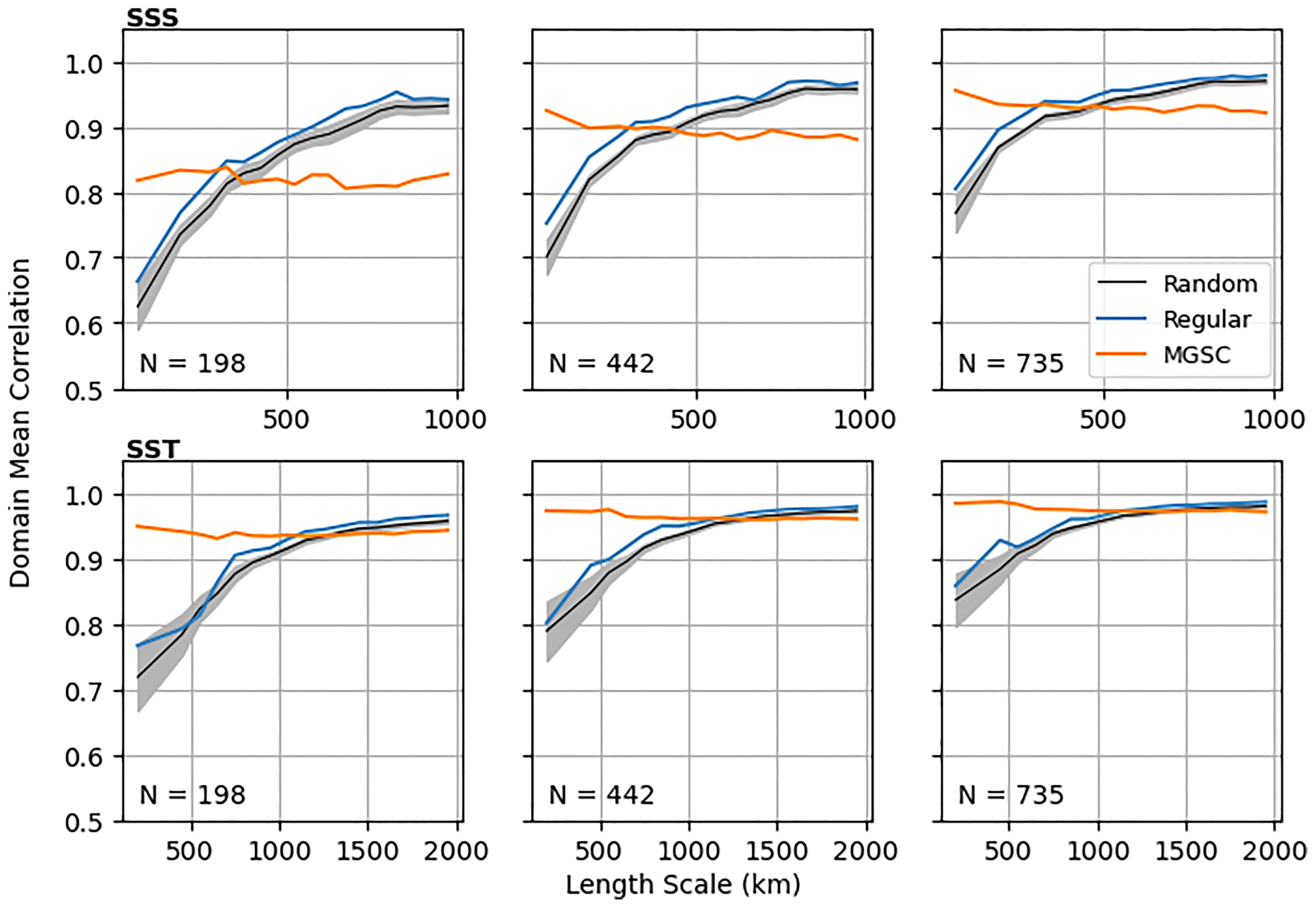 Figure 3 summarises these values for different values of N and compares them to the resulting correlations obtained when using a regular grid of observations and an ensemble of random locations. For both SSS and SST, the mean correlations are comparable across all values of N, with the regular grid being slightly better at low values and the random grids being worse across all N. However, the largest differences are seen when examining minimum correlations, which are significantly better for the MGSC method, improving upon those for the regular and random grids by 2-3 times across all N.