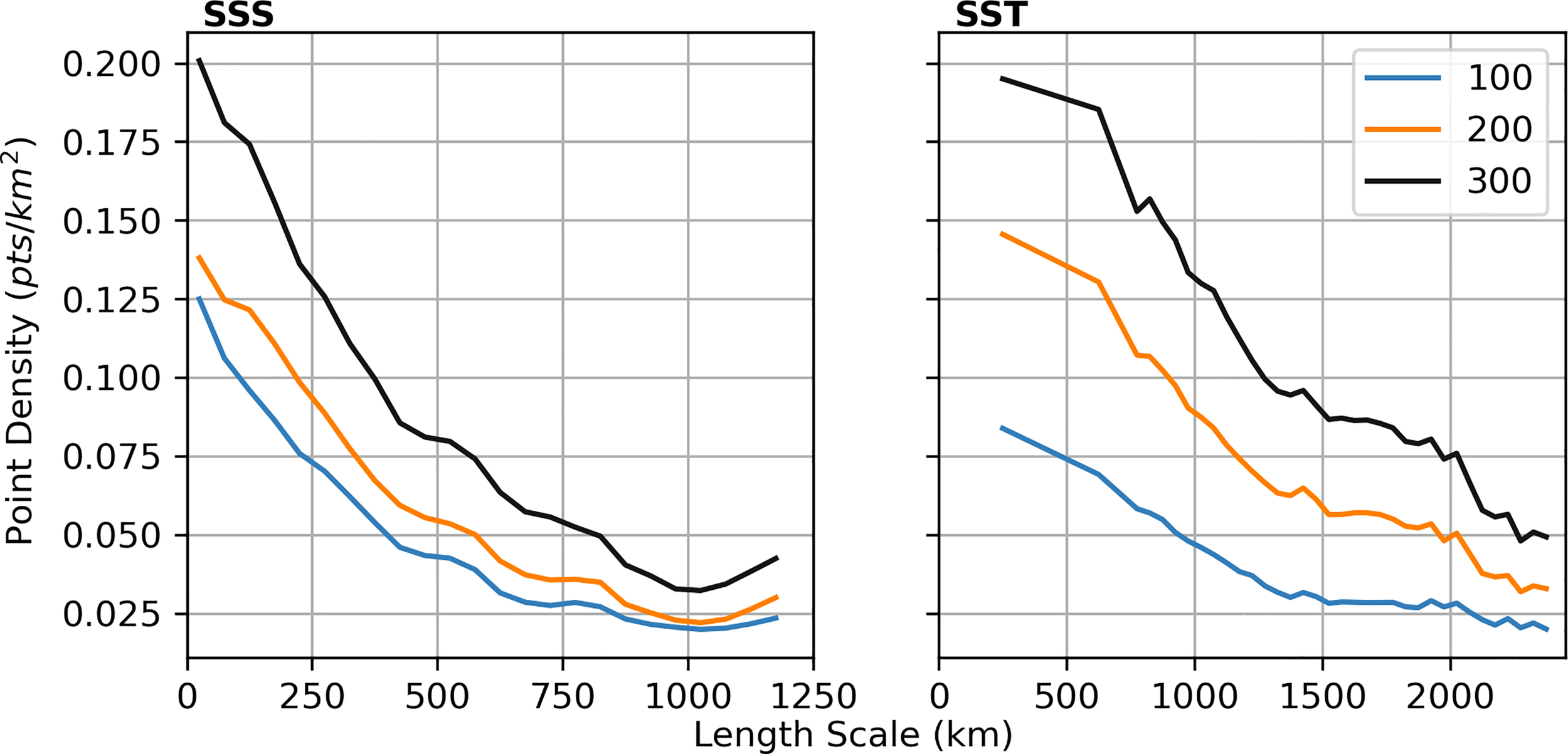 where α is a constant to be determined using a least squares fit, r is distance and p0 is that point at which want to estimate the length scale. We use an approximate e-folding scale at each point to then estimate the local length scale by solving . Computing point densities as before, Figure 4 shows how density varies with independently calculated length scales. This comparison is shown for N = 100, 200 and 300. In all cases, there is an inverse relationship between point density and length scale, with point density decreasing as length scales increase. This confirms that the MGSC method is doing as we expected: placing more observations in areas where the dominant length scales are smaller.
