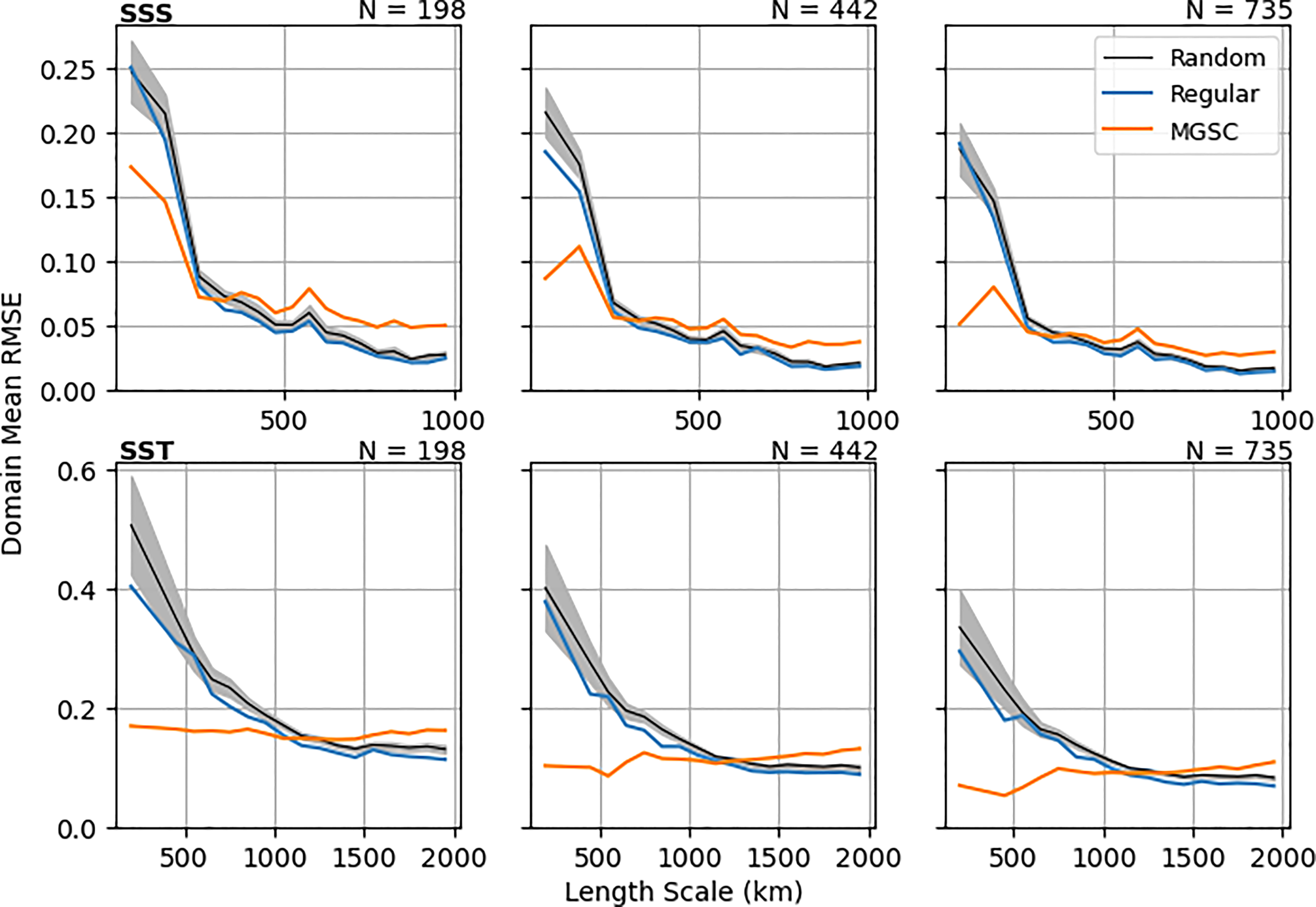 Figure 7 shows reconstruction RMSE averaged into length scale bins. This has been done for N=198, 442 and 735, which correspond to the number of points in three regular networks of different sizes. Generally as N increases, errors decrease for all location methods, especially at smaller length scales. For the regular observation grids and random locations, errors are larger where length scales are smaller (for both SSS and SST). However, the MGSC method sees significantly smaller errors in these regions, especially for larger values of N. Figure 8 shows similar results for correlations, also averaged into length scale bins. Correlations are significantly smaller at finer length scales for both the regular and random observation placements. However, the MGSC method provides a consistent correlation level across all length scales. For smaller values of N, this means improvement at small length scales but also smaller correlations at larger length scales. This difference decreases for larger values of N.