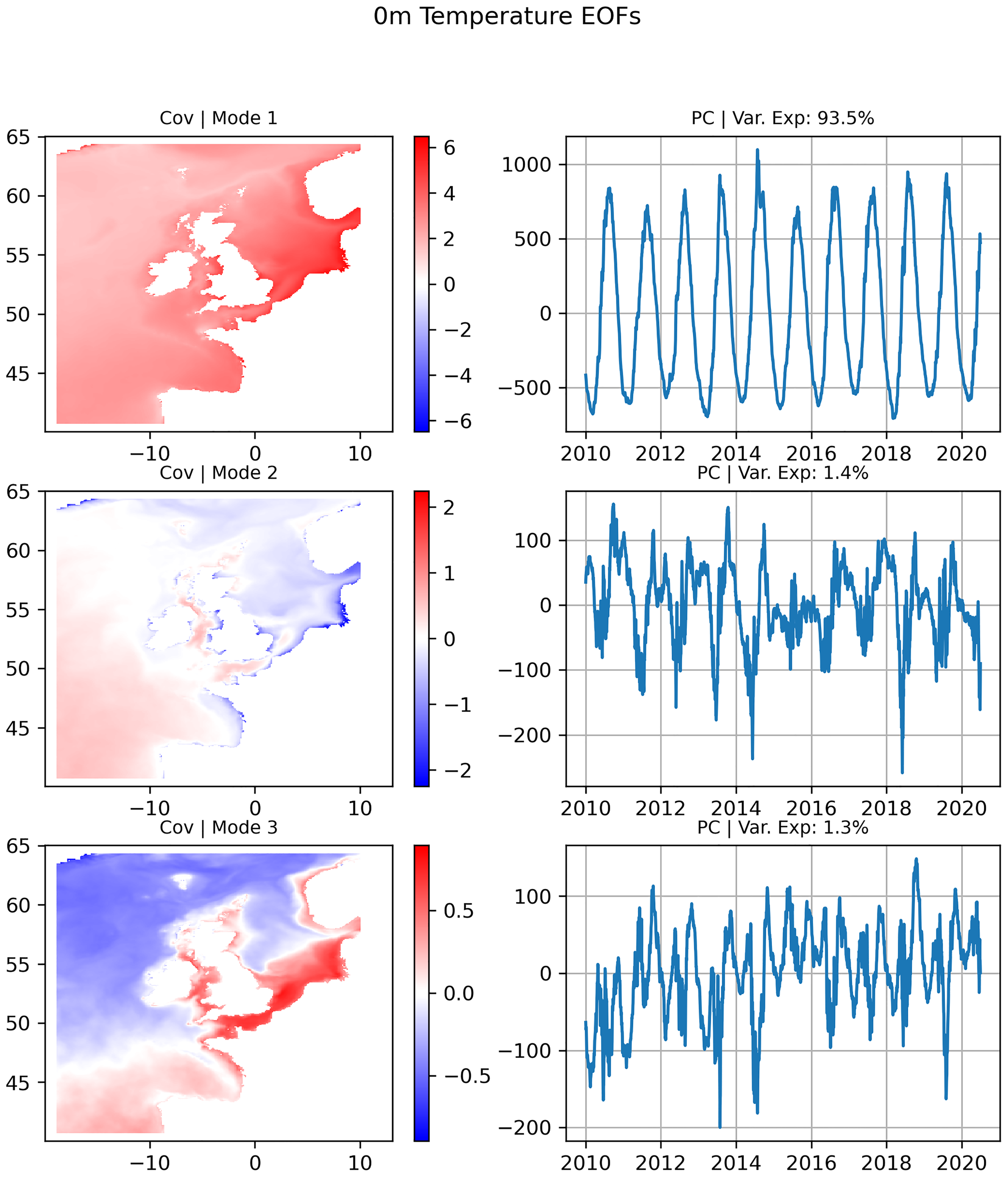 We can further investigate this using an EOF (empirical orthogonal function) analysis. This is a method which can be used to decompose a 2D signal into orthogonal spatial patterns and time series. The result is a set of time series describing a consistent signal across the data (e.g. seasonality or diurnal periodicity) and associated covariance fields, which describe the 2D structure of the signal component. Figure 9 shows the largest three EOF modes for SST during the 2010-2020 period, calculated using the COAsT Python package (Polton et al., 2021). The first mode shows a domain-scale signal with an annual period that explains 93.5% of the variance in the domain. As the whole domain is moving together at this frequency, applying the MGSC method immediately to it will result in very few observation locations with very high correlations. For example, applying the method to the full SST signal shows that a minimum correlation of 0.9 may be achieved with just 5 points, as opposed to 350 when the data has had seasonality removed.