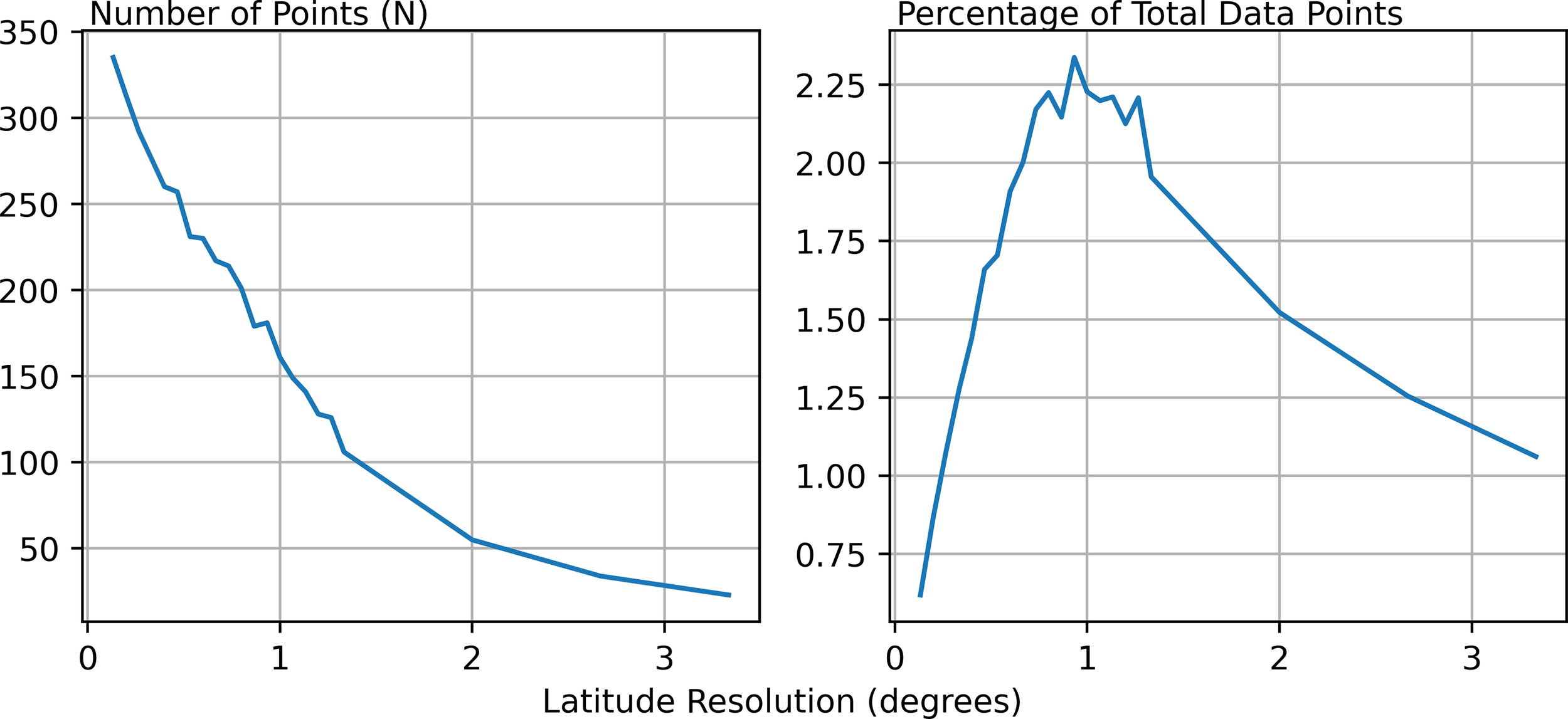 A comparison of the number of points required to obtain a minimum correlation of 0.75 when the data has been downscaled to different resolutions. Each plot is for Sea Surface Salinity, which is used as an example. Left: The number of points required for each downscaled latitudinal resolution. Right: The number of points required as a percentage of the total number of data points within the downscaled dataset.