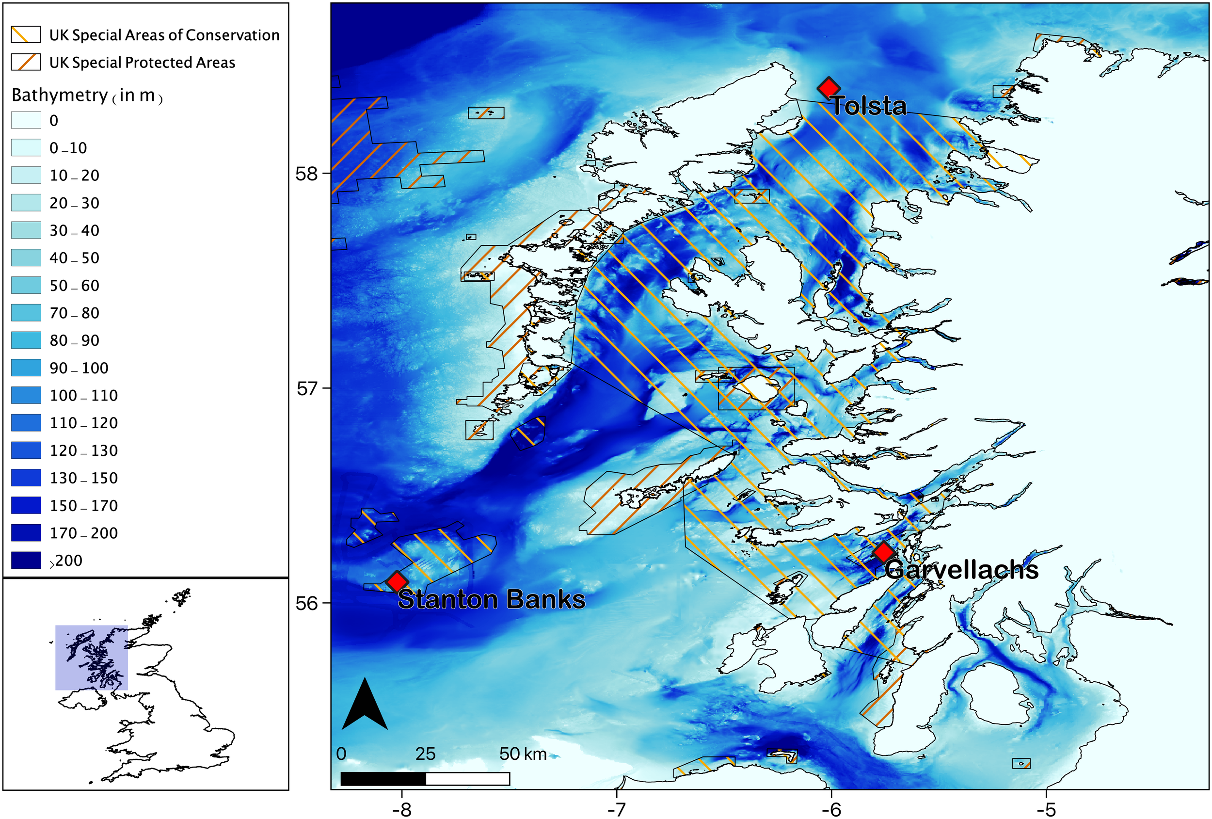 The location of the three hydrophone moorings used in this work, located off the west coast of Scotland, UK. Stanton Banks, Tolsta and Garvellachs recorder water depths were 72m, 102m and 95m respectively and are part of the EU INTERREG COMPASS project which aims to provide effective monitoring and management of Marine Protected Areas, including both Special Areas of Conservation and Special Protected Areas. Bathymetry data was sourced from GEBCO and Digimap.