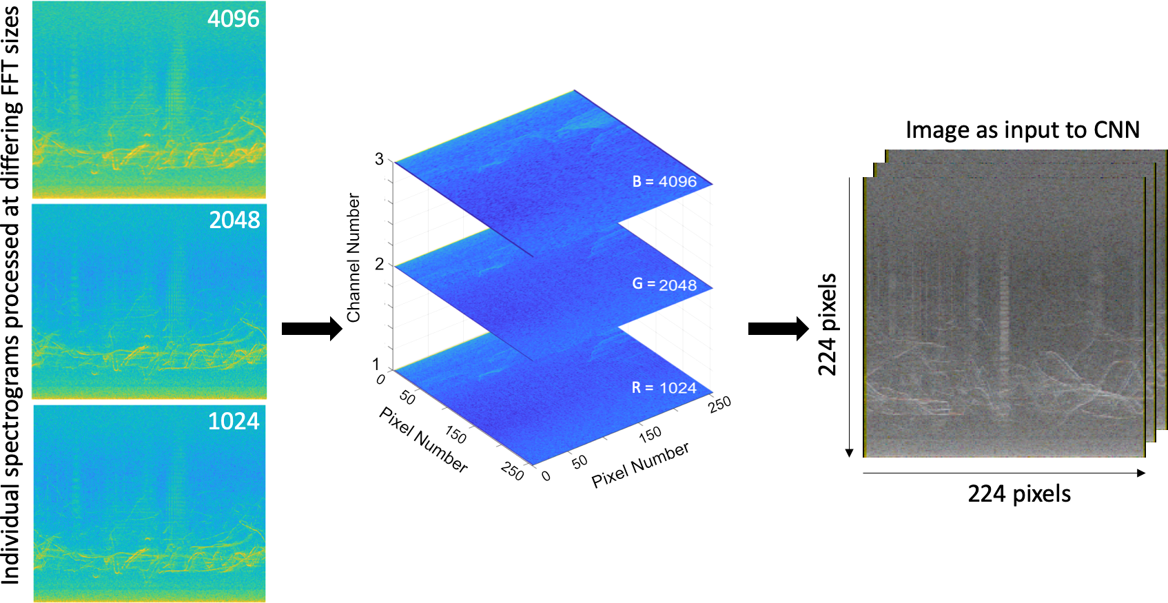 Graphic demonstrating the structure of the input to the model, a 3-channel greyscale spectrogram and is resized after processing to 224x224. Three spectrograms were produced for each wav file with different FFT size parameters as input: NFFT values were standardised for the equivalent of 1024, 2048 and 4096 points per each sample rate with a constant frequency increment of 93.75 Hz, 46.88 Hz and 23.44 Hz respectively. Spectrograms were computed using a Hanning window and 75% overlap. The three images were stacked within one of three color channels of the image in order, allowing the CNN to ‘see’ each sound source represented at various resolutions.