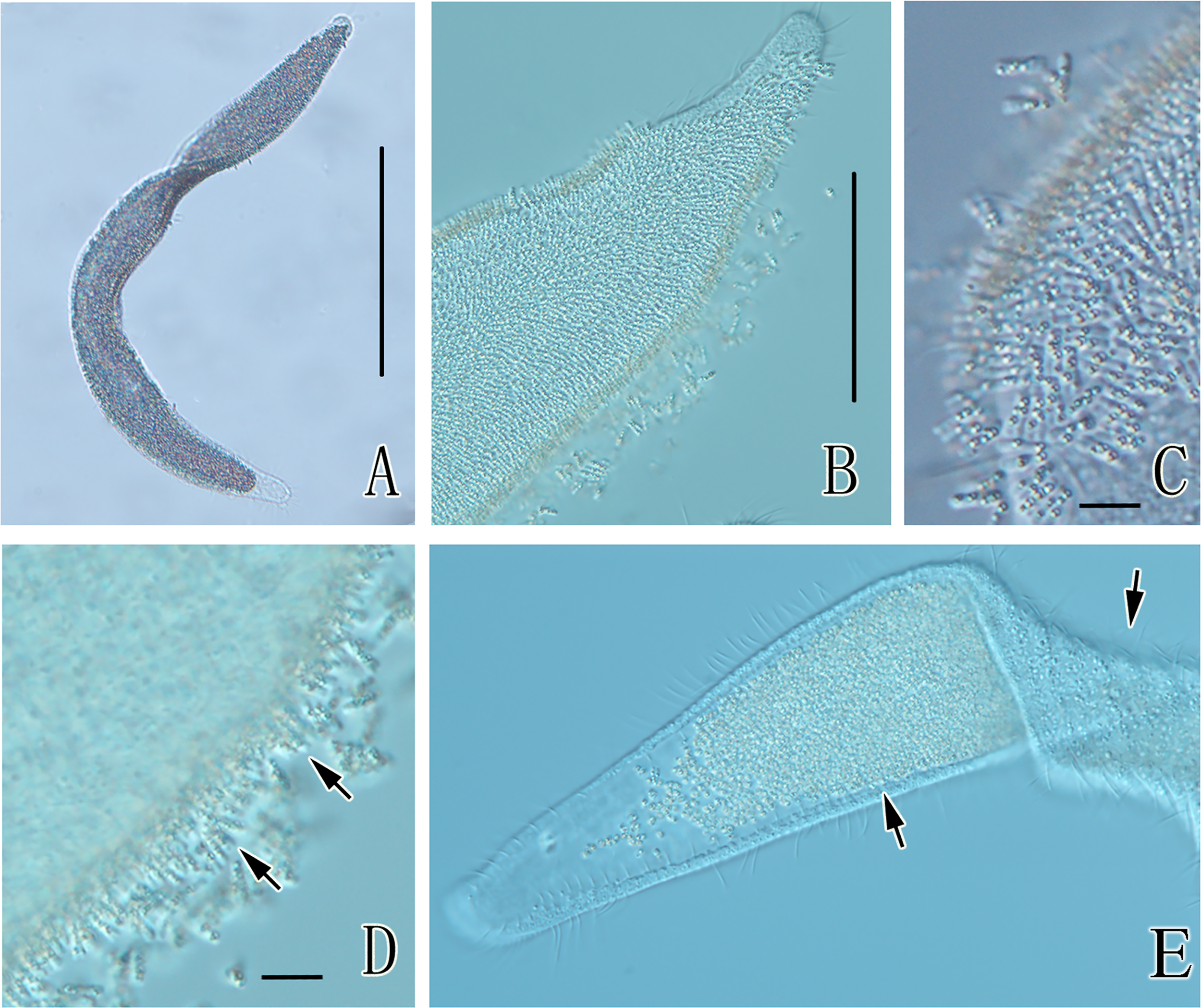 The size of the host ciliate was 200-460 × 16-36 μm in vivo, with a length:width ratio of 8-12:1 when fully extended (n=20; SD=71.5 and 7.8 for the length and width, respectively). The cells were highly flattened and had long ribbon shapes (Figure 1A). The body was curved (Figure 1A). The cells crawled along the bottom of the petri dish and attached to the substrate when stimulated. The ciliate had no cytostome. Nearly the entire dorsal surface of the cell was covered by rod-shaped bacteria that attached to the host erectly with one end (Figures 1B–E). Refractile globules (approximately 1 μm in diameter) were found within nearly all the rod-shaped bacteria (Figures 1C, D). The ventral side of the ciliates showed no symbiotic bacteria (Figure 1E).