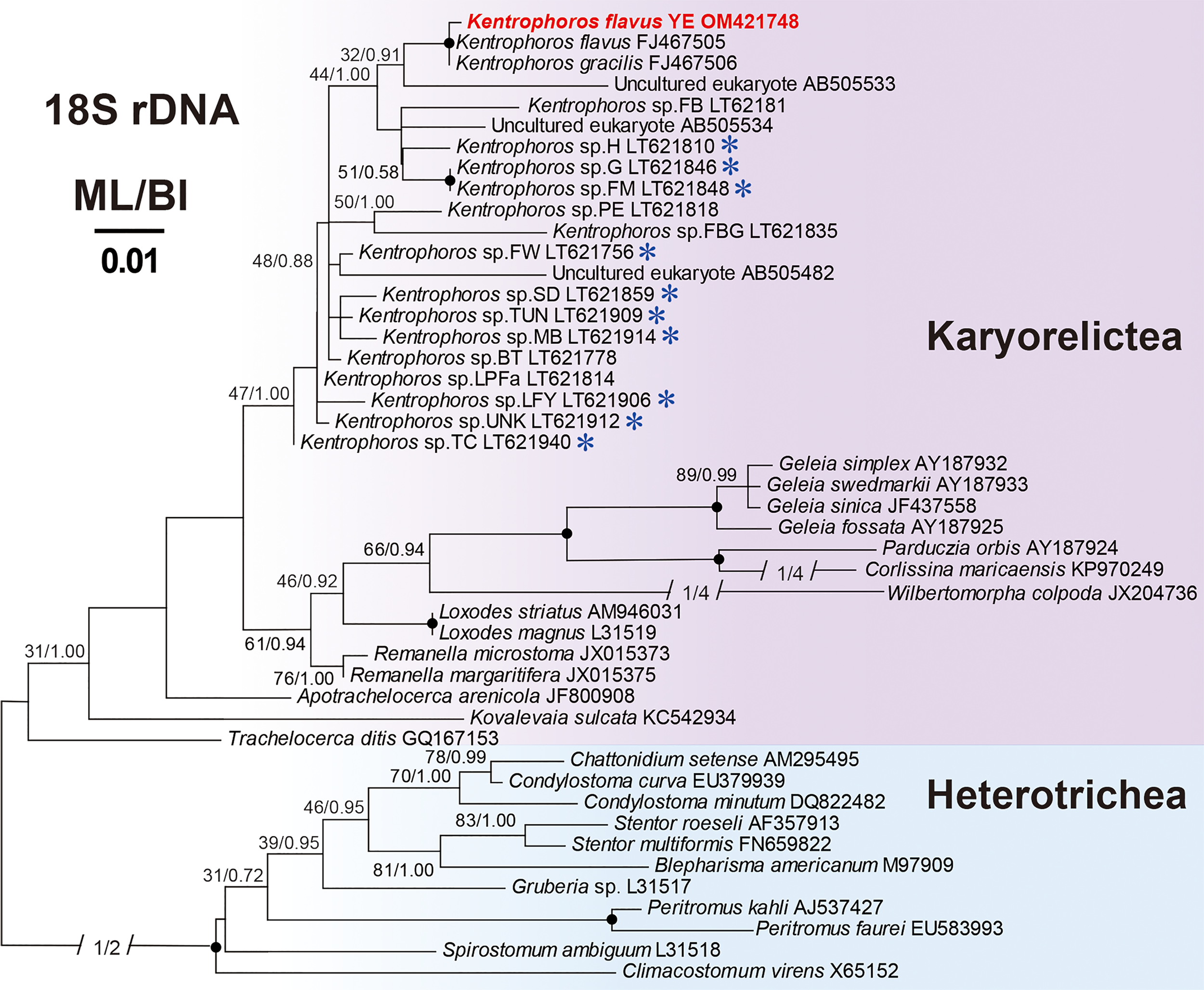 Maximum likelihood (ML) tree based on the 18S rRNA genes showing the positions of Kentrophoros flavus YE (in red) with a GTR + I + Г model. The numbers on the nodes represent the bootstrap values of the ML and the posterior probability of the Bayesian inference (BI). The black dot on the node represents the bootstrap value >95%. The species marked with blue asterisks have been reported with thiotrophic ectosymbionts. GenBank accession numbers are given following the species names. All branches are drawn to scale.