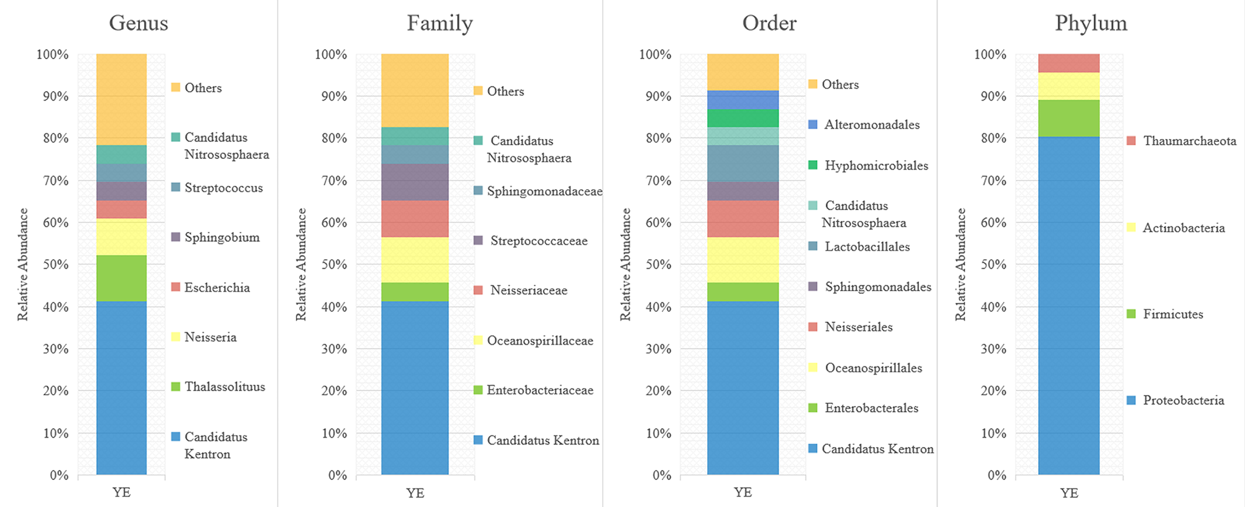 The OTU “Ca. Kentron” YE always displayed the highest proportion (41.3% in the clone library data and 53.89% in the PacBio data) among the K. flavus-associating bacteria (Figures 3, 4). This aligns with the previous study that used the meta-genomic technique to detect the genus “Ca. Kentron” in 13 Kentrophoros morphospecies (Seah et al., 2017). Compared with the most similar relative, “Ca. Kentron” H (Table 2), “Ca. Kentron” YE was different by 70 bases in the primary 16S rRNA sequence, indicating that “Ca. Kentron” YE may represent a new ectosymbiotic species of the genus “Ca. Kentron”.