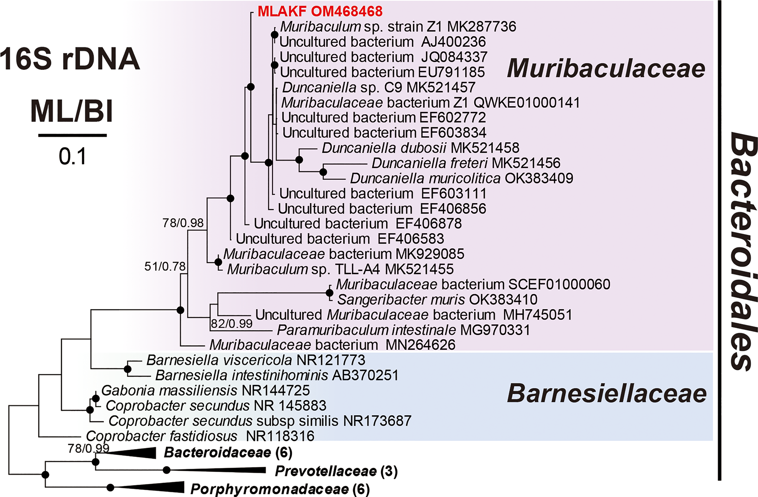 Maximum likelihood (ML) tree based on the 16S rRNA genes showing the positions of MLAKF (in red) with a GTR + I + Г model. The numbers on the nodes represent the bootstrap values of the ML and the posterior probability of the Bayesian inference (BI). The black dot on the node represents the bootstrap value > 95%. Genbank accession numbers are given following the species names. All branches are drawn to scale.