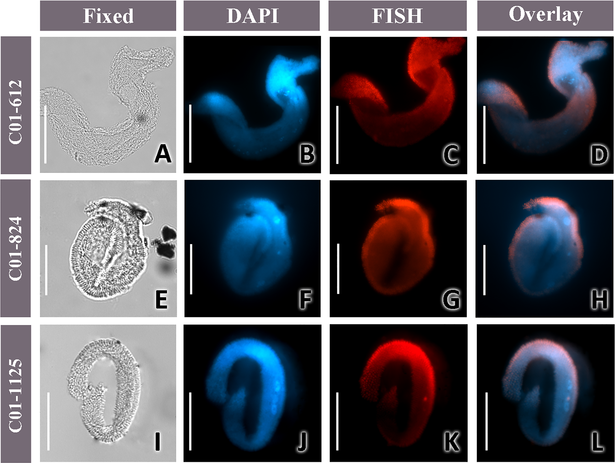 Micrographs of K. flavus with MLAKF. (A, E, I) Microphotographs of the fixed cells in the bright field; (B, F, J) DAPI staining; (C, G, K), and fluorescence in situ hybridization (FISH) using Cy3-C01-612 (C), Cy3-C01-824 (G), and Cy3-C01-1125 probes (K); (D, H, L) overlay of the DAPI and FISH. Scale bars = 50 μm (A–L). The result for C01-824 was derived from a double-label experiment with a probe solution of 3.5 μl of Cy3-C01-824 plus 0.5 μl of AF488-chrCa, while others were generated from a single-probe (4-μl probe solution) hybridization.