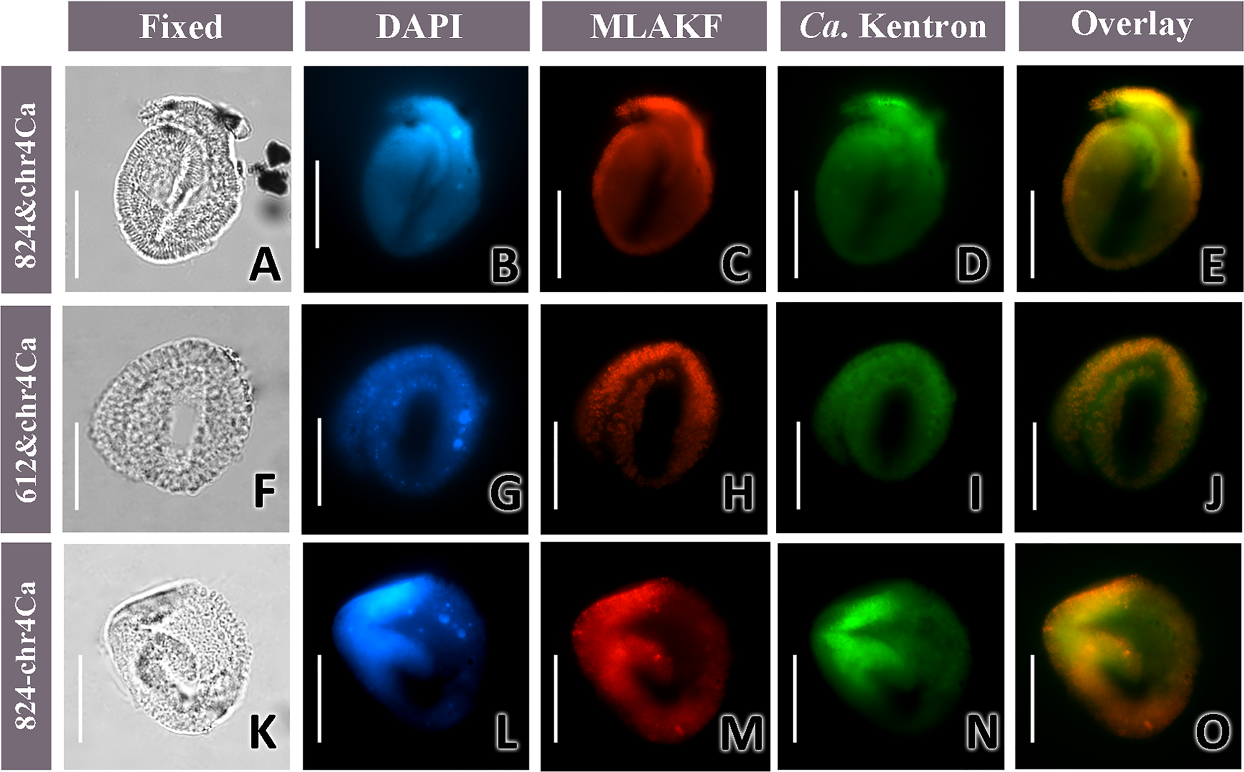 Double-label experiments on the same cell with both the Cy3-C01-612/824 and AF488-chr4Ca probes; (A, F, K) microphotographs of the fixed cells in the bright field; (B, G, L) DAPI staining; (C, H, M) species-specific probes Cy3-C01-824 (C, M) and Cy3-C01-612 (H); (D, I, N) species-specific probe AF488-chr4Ca; and (E, J, O) overlays of Cy3 and AF488 images. Scale bars = 50 μm (A–O). For the cells in images A and F, the probe solutions of 3.5 μl of Cy3-C01-824/612 plus 0.5 μl of AF488-chrCa were applied, while for the one in K, 2 μl of Cy3-C01-824 plus 2 μl of AF488-chrCa were applied.