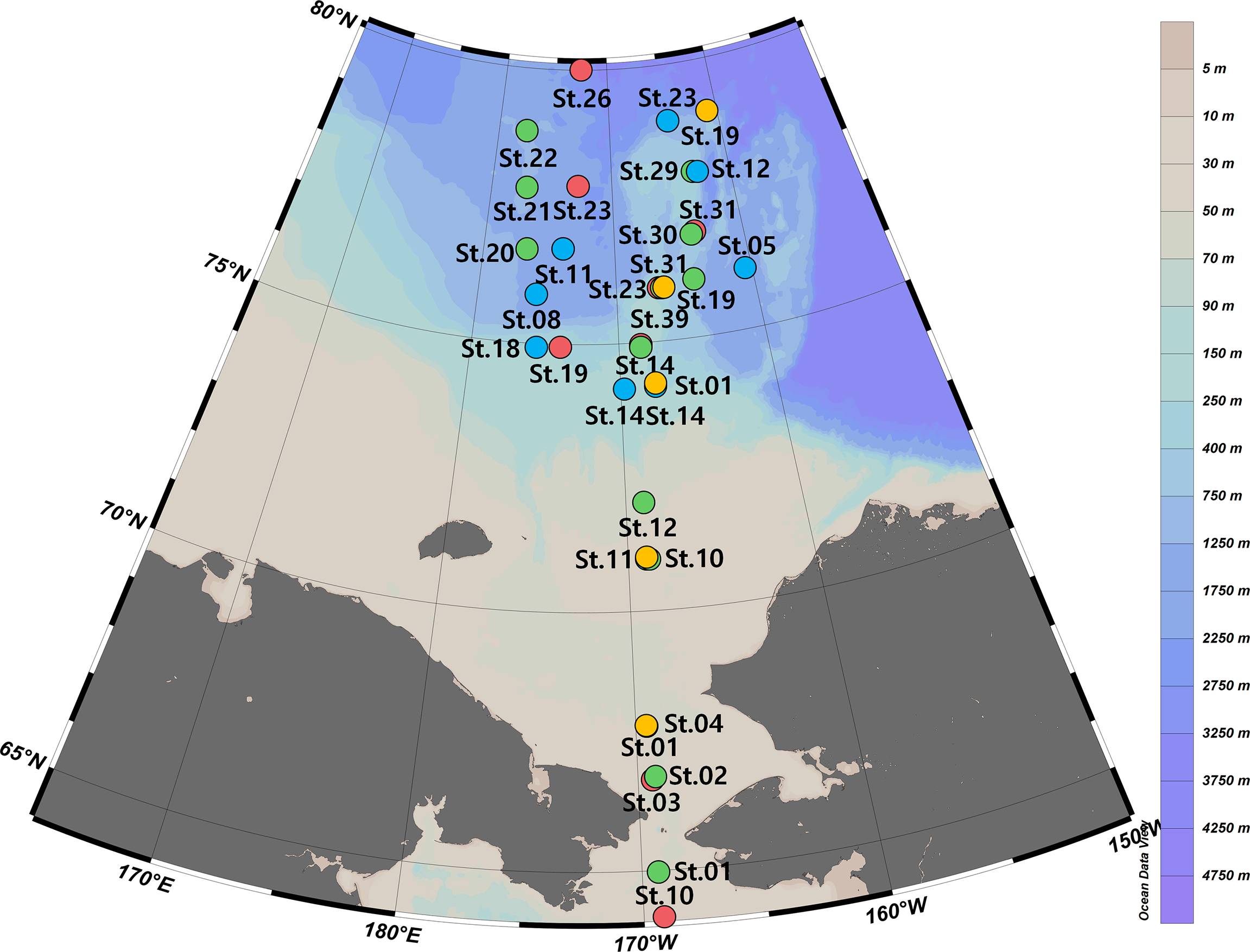 The Chukchi Sea, which is connected to the Arctic Ocean and extends northwards, involves complex currents that facilitate the northward transport of the Pacific waters through the Bering Strait and exerts a significant impact on regional circulation, freshwater supplements, and nutritional distribution (Weingartner et al., 1998). Furthermore, the central northern Chukchi Sea water mass significantly affects the transport (Weingartner et al., 2005). Owing to the latitudinal differences between the Pacific Ocean and the Arctic Ocean, the warm and salty waters of the Bering Sea flow into the Chukchi Sea, resulting in the melting of sea ice in summer (Shimada et al., 2006). Three Pacific inflows enter the Chukchi Sea in succession, and these water masses affect the Arctic Ocean. The first is water from the Gulf of Anadir (AW), with low temperature and high salinity, while the second and third are, respectively, waters from the Bering Strait (BSW), having high temperature and salinity and low silica characteristics, and from the Alaska Coast (ACW), which is introduced after melting ice and has low salinity and low nitrogen concentration (Grebmeier et al., 1988; Aagaard et al., 2006). Overall, the location of the Pacific summer waters and the contents of the Chukchi Sea exert a significant impact on physical conditions, nutrients, and phytoplankton communities therein (Mordy et al., 2020; Wang et al., 2020).