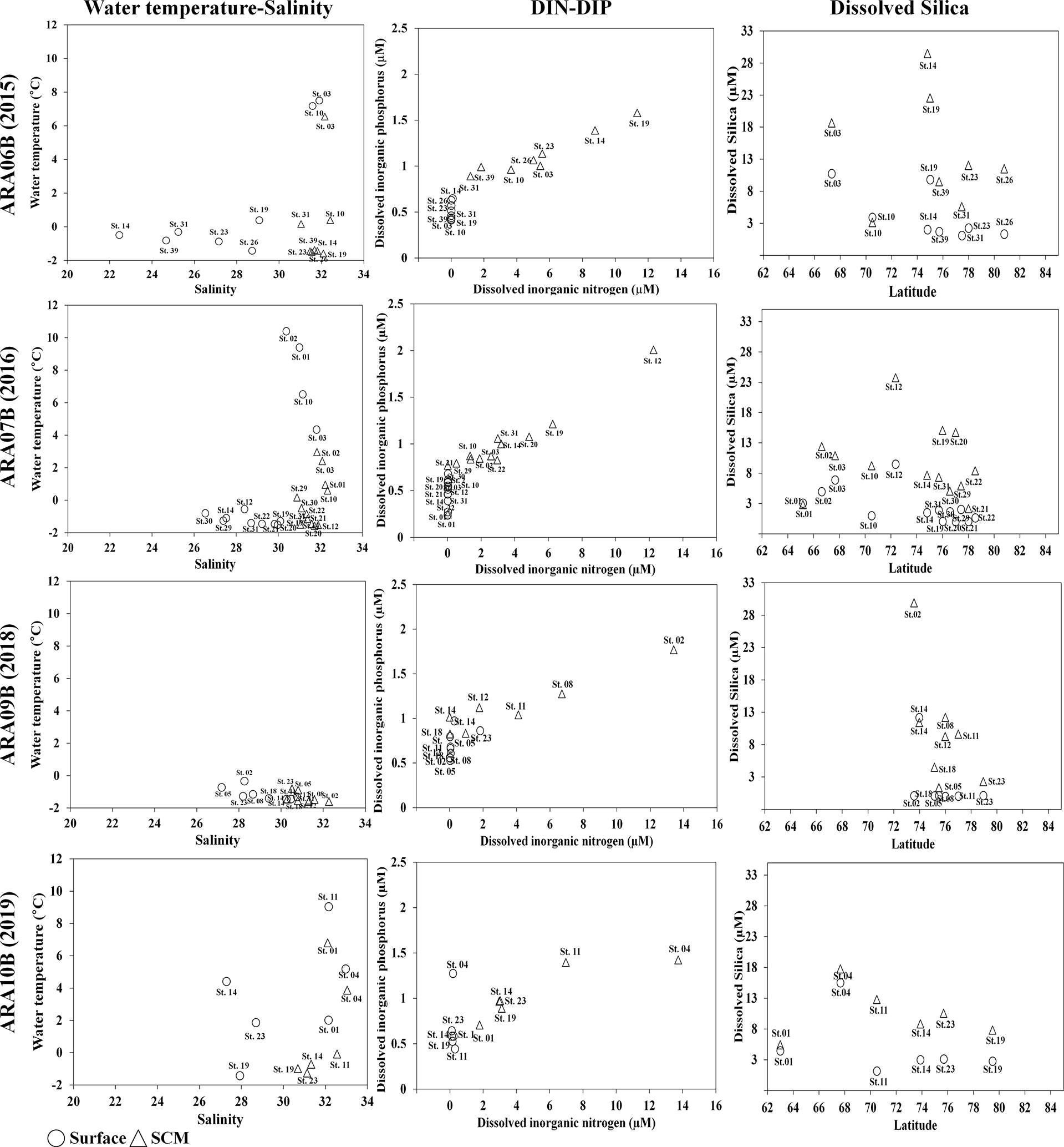 Changes in the environmental factors in the Arctic Ocean in the late summers during 2015-2019. The temperature-salinity plots obtained from each cruise. Plots of inorganic nutrient values [dissolved inorganic nitrogen(DIN)-dissolved inorganic phosphorus (DIP), and dissolved silica (DSi)] obtained from each cruise. SCM, subsurface chlorophyll maximum layer.