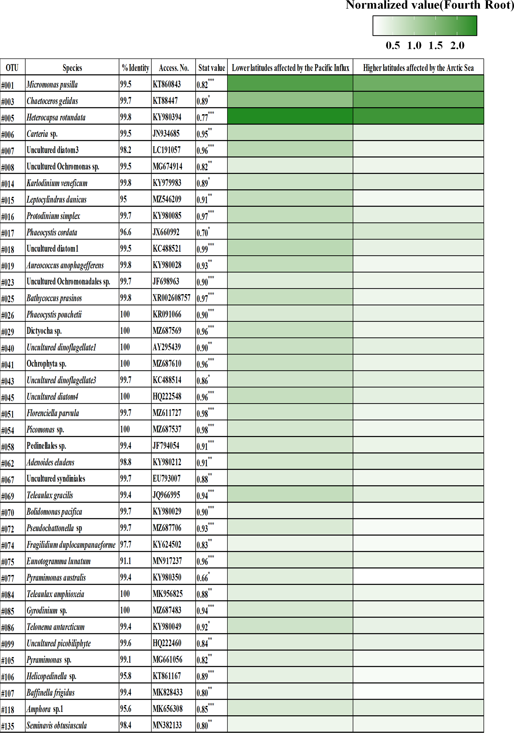 Heatmap showing the phytoplankton indicator species in the Arctic Ocean. The identified phytoplankton at the species level, including the related significant indicator value and p value (*<0.05, **<0.01, and ***<0.001). The heatmap displays the fourth root normalized data at the range of 0 to 3. Two Groups were obtained from the nMDS analysis presented in Figure 3.
