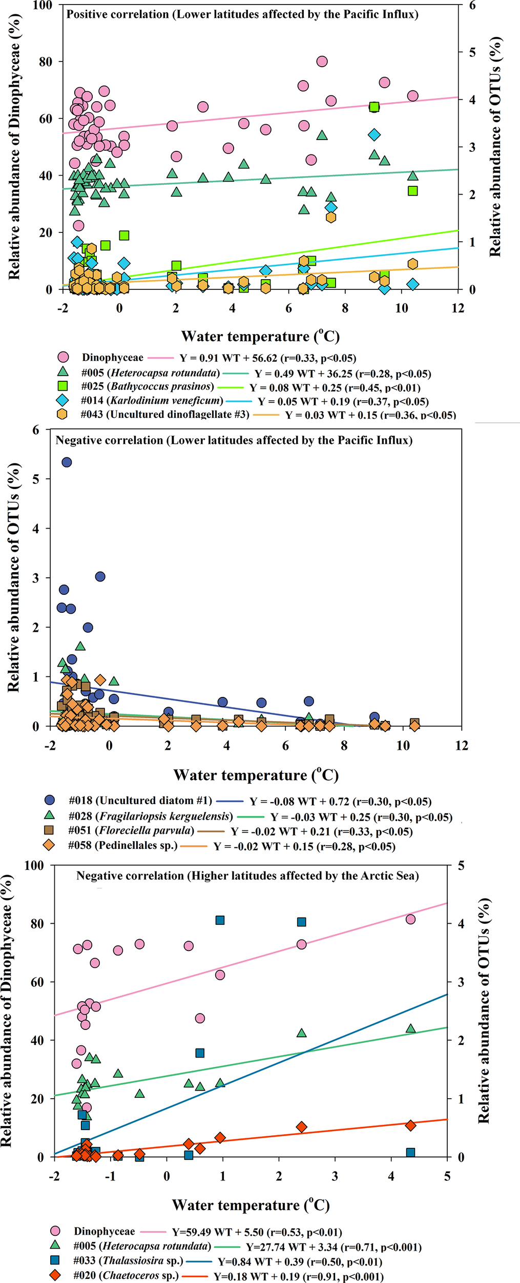 Studies on the dynamics of core phytoplankton in the Arctic Ocean can be used to understand the implications of Arctic warming. The environmental factors were strongly divided into three Groups: “effects of surface layers at lower latitude,” “effects of SCM layers at lower latitude,” and “effects of higher latitude”. The water masses that flow through the Bering Strait and Chukchi Sea, as well as the low temperature and salinity in the Arctic Sea, could be affected by the ice-melting process, because the phytoplankton community structures are highly dependent on the water mass types. OTU #005 (H. rotundata) is the predominant taxon in the Arctic Oceans, but nano- and pico-sized core phytoplankton such as OTU #003 (C. gelidus) and OTU #001 (M. pusilla) may benefit from extreme climate conditions and are regarded as a potential ‘‘winners of climate change”. In addition, some phytoplankton (OTU #018, #028, #051, and #058) showed potential psychrophilic activity. Although the Arctic Ocean is a very important area of research to interpret climate-related changes, such studies are limited by the difficulties in accessing the investigation area. In addition, limited information is available on the short-term environmental impacts on the phytoplankton communities in the Arctic region. Therefore, to investigate the effect of climate change on phytoplankton communities of the pico-sized taxa through long-term investigations, Arctic based field studies require continuous efforts. This study elucidated the responses of the phytoplankton community to latitudinal differences in late summer seasons and phytoplankton interactions through extreme environmental dynamics.