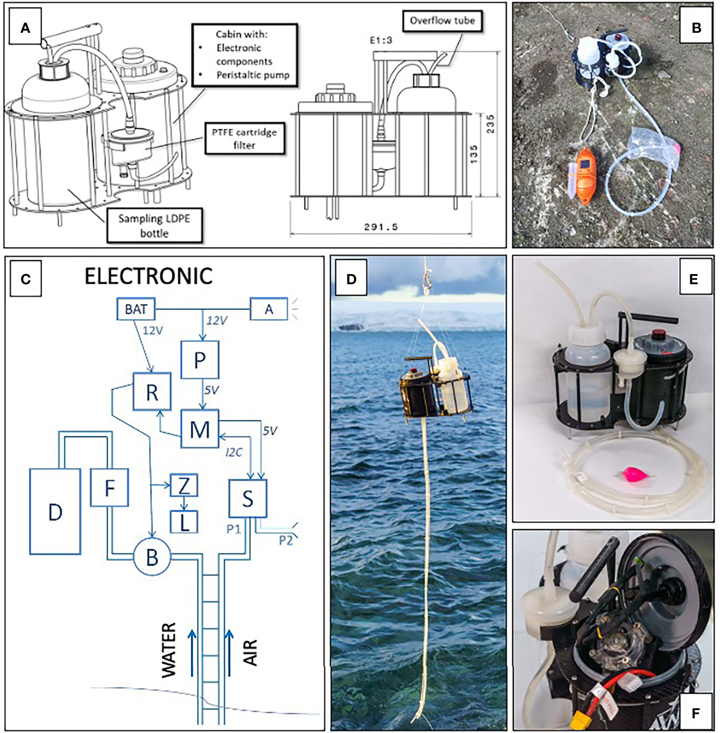 The AWA system: (A) schematic representation of the device components (Dronetools©) with sizes expressed in mm; (B, D, E) pictures of the whole system including, AWA and multiparameter probe [CastAway-CTD®, orange instrument: (B)]; (F) picture of components inside the cabin; (C) system components scheme (BAT, lipo battery; A, low battery alarm; P, DC-DC 5V power supply; R, relay 12 V; M, microcontroller; S, pressure sensor (P1, tube air pressure; P2, tube atmosphere pressure); Z, active pump buzzer; L, active pump flash light; B, peristaltic pump; F, PTFE Cartridge filter; D, sampling LDPE bottle; I2C, sensor communication protocol).