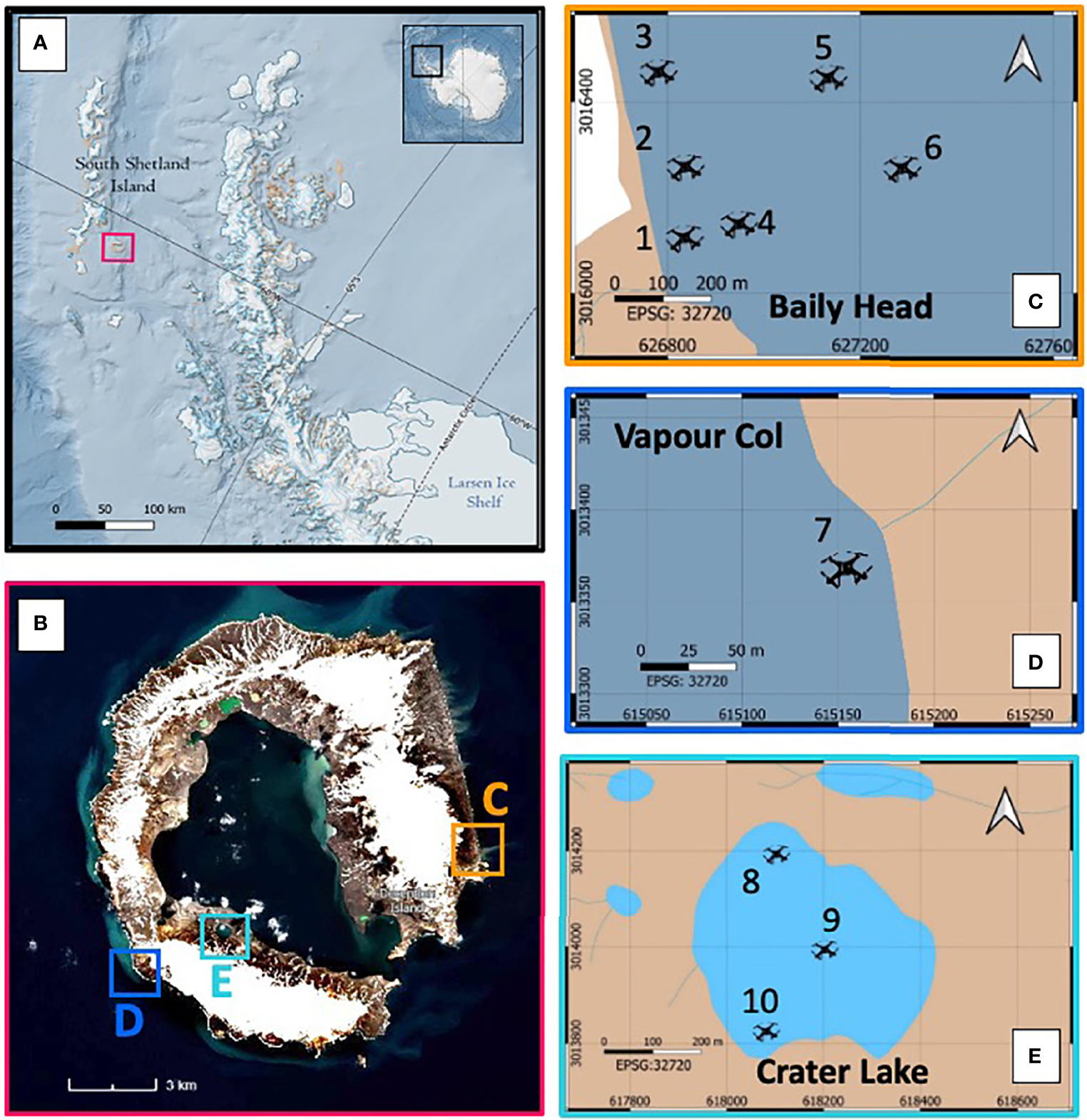 (A, B) Location of Deception Island in the South Shetland Islands. Sampling stations at: (C) Baily Head rockery, (D) Vapour Col and (E) Crater Lake.