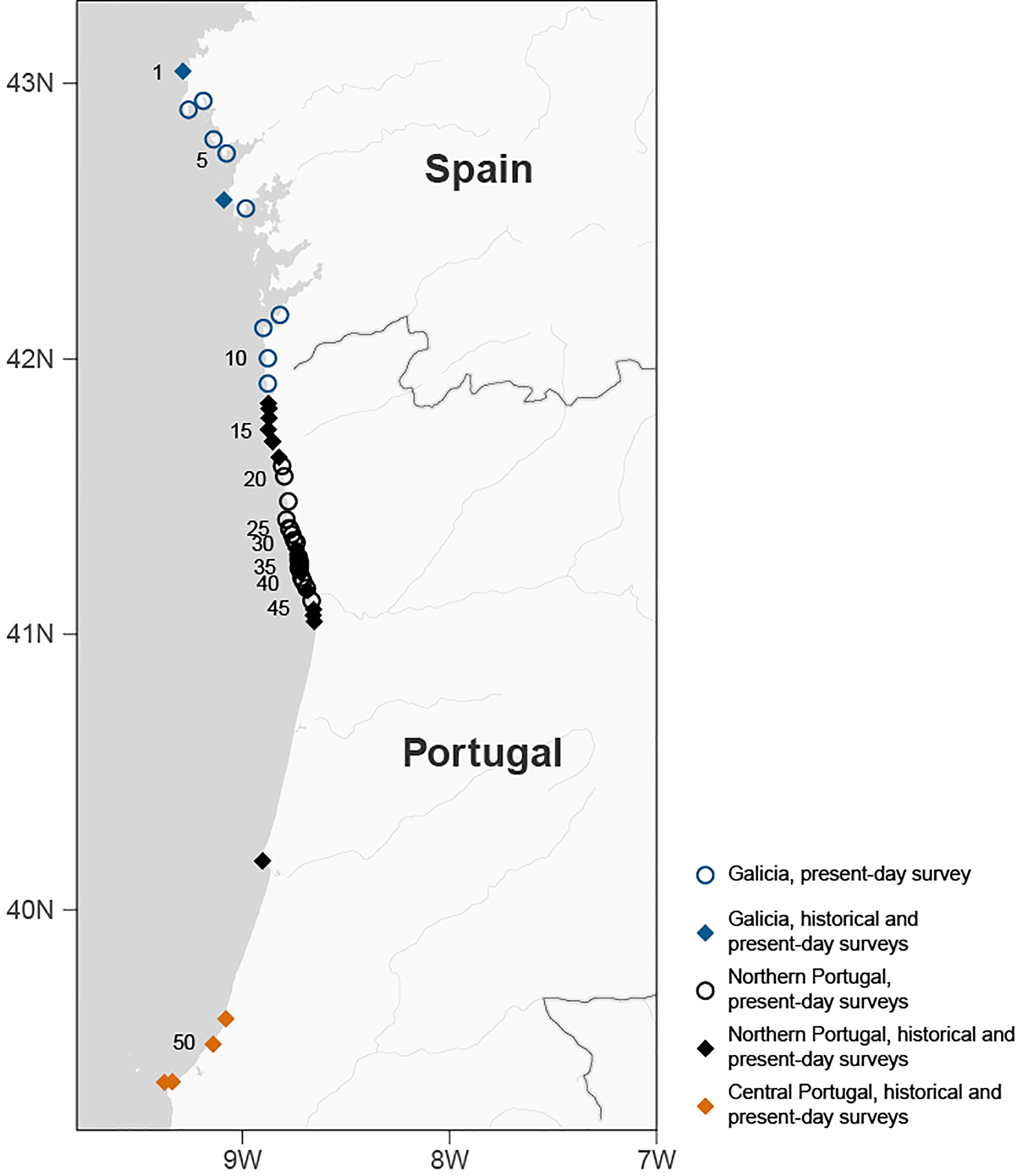 Map of the surveyed sites. Locations are numbered in multiples of 5, from the northernmost (1) to the southernmost site (52). For more details on the sites see Supplementary Table 2. Blue symbols correspond to sites in Galicia, black symbols to sites in northern Portugal and orange symbols to sites in central Portugal. Open circles indicate locations only visited in 2020-2021 while closed diamonds indicate locations visited both in 2001-2005 and 2020-2021.