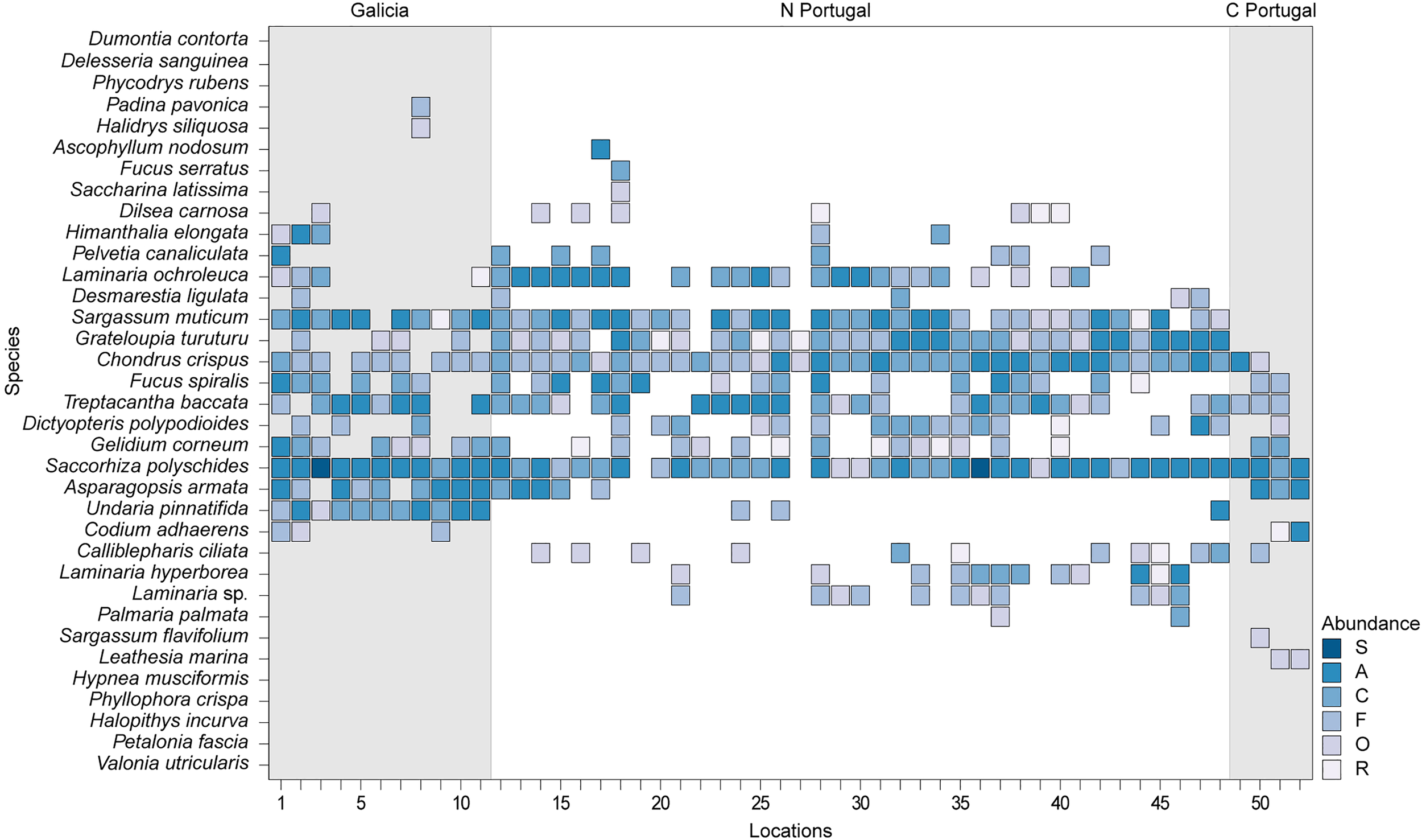 Abundance of selected species (y-axis) in North-western Iberia. In the x-axis, locations are identified by an ID number, from the northernmost (1) to the southernmost site (52). For more details see Supplementary Table 2. Color gradient indicates abundance based on the SACFOR abundance scale. S, Super Abundant; A, Abundant; C, common; F, frequent; O, occasional; R, rare.
