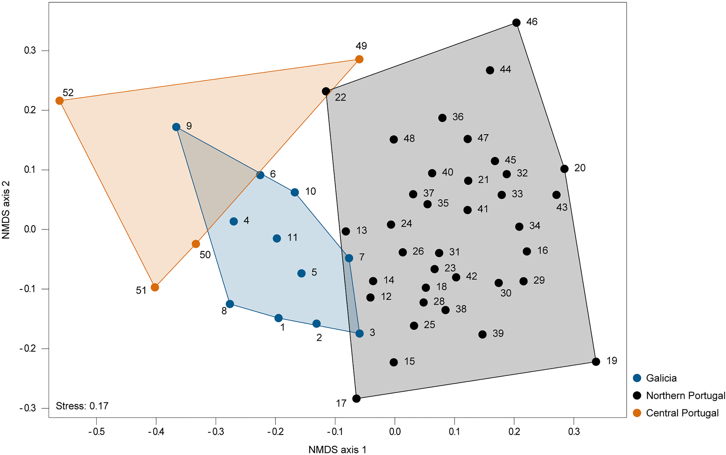 NMDS ordination plot of all sites based on the Bray-Curtis dissimilarity index. Blue symbols and blue polygon correspond to sites in Galicia, black symbols and black polygon correspond to sites in northern Portugal and orange symbols and orange polygon correspond to sites in central Portugal. Locations are depicted by an ID number, for more details see Supplementary Table 2.