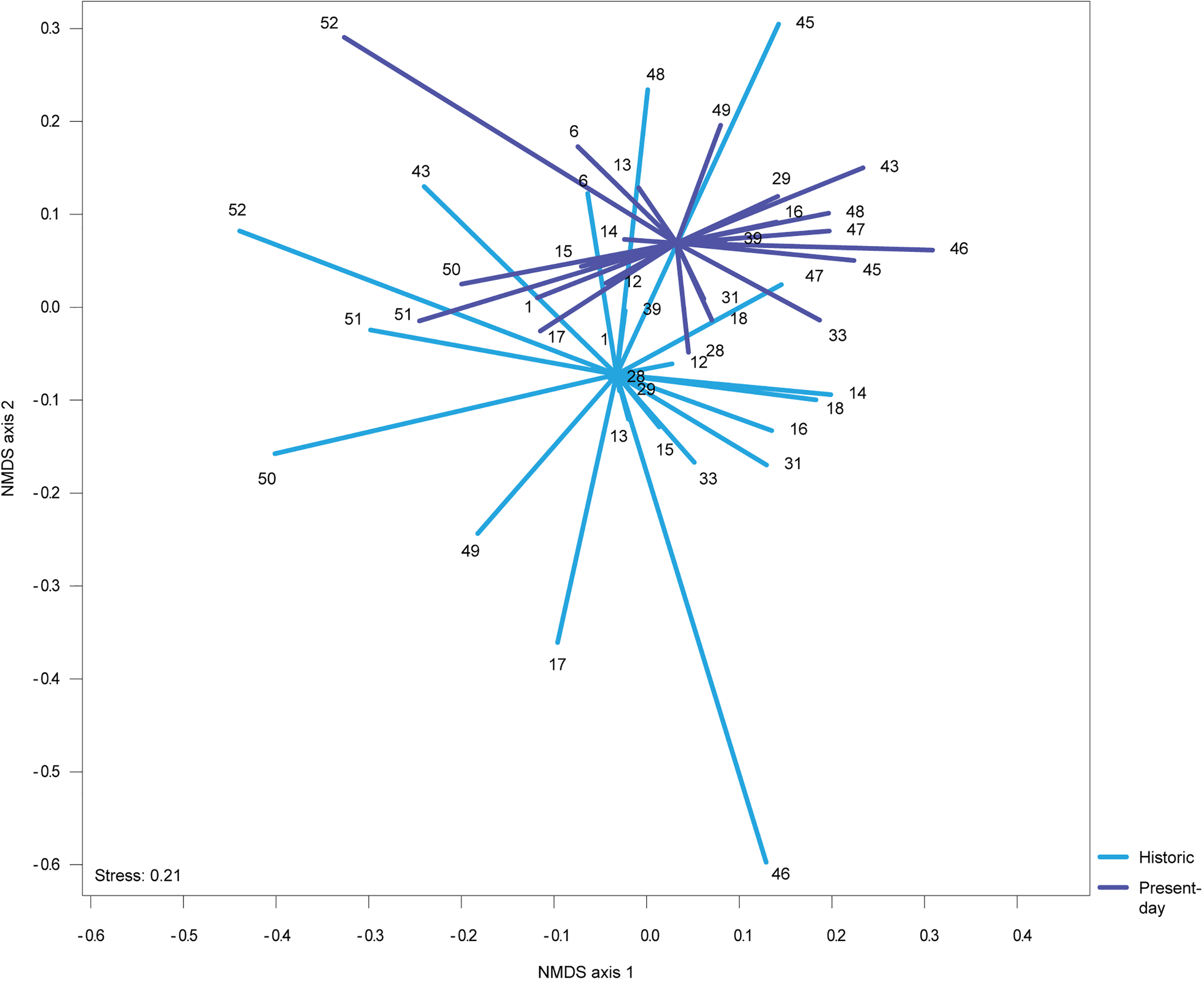 The NMDS presented in Figure 4 shows that the average dispersion of locations around their centroid, based on each site’s species composition, is smaller in present-day data than in historical data although, probably owing to the high variability within each group, the trend is not statistically significant (t (36.057) = 1.4812, p = 0.1472).