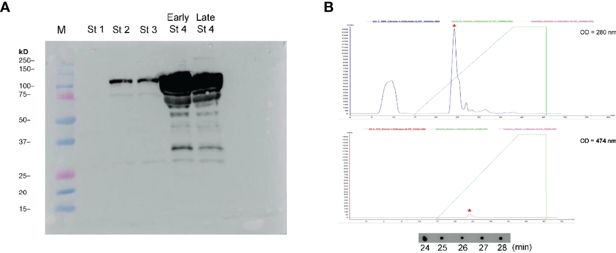 (A) Validation of anti-MrVn in probing the Vn subunits of the S. olivacea, lane M referred to molecular ladder, St1-Late St4 referred to the ovary samples taken from stage 1 to late stage 4, respectively. (B) Chromatogram of ovarian extract of S. olivacea as fractionated by ion exchange FPLC on a HiScreen™ Q HP columns and monitored at wavelengths of 280 nm and 474 nm, respectively. Asterisk showed the immunoreactive peak whose fractions (24-28 min) were confirmed by dot blot with anti-MrVn.