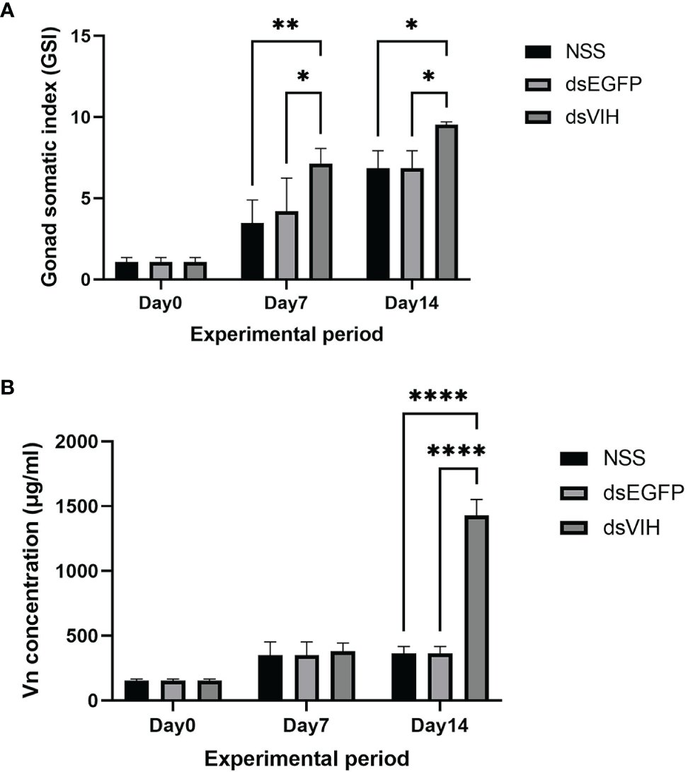 At day 14 and day 28 post injection, the ovarian development was determined by GSI value and hemolymph Vn level. The dsRNA-VIH treated crabs significantly produced higher GSI compared with the control group (Figure 5A). Moreover, the hemolymph Vn level of the dsRNA-VIH treated crabs at day was significantly greater than that of the control crabs at the same day of comparison (Figure 5B).