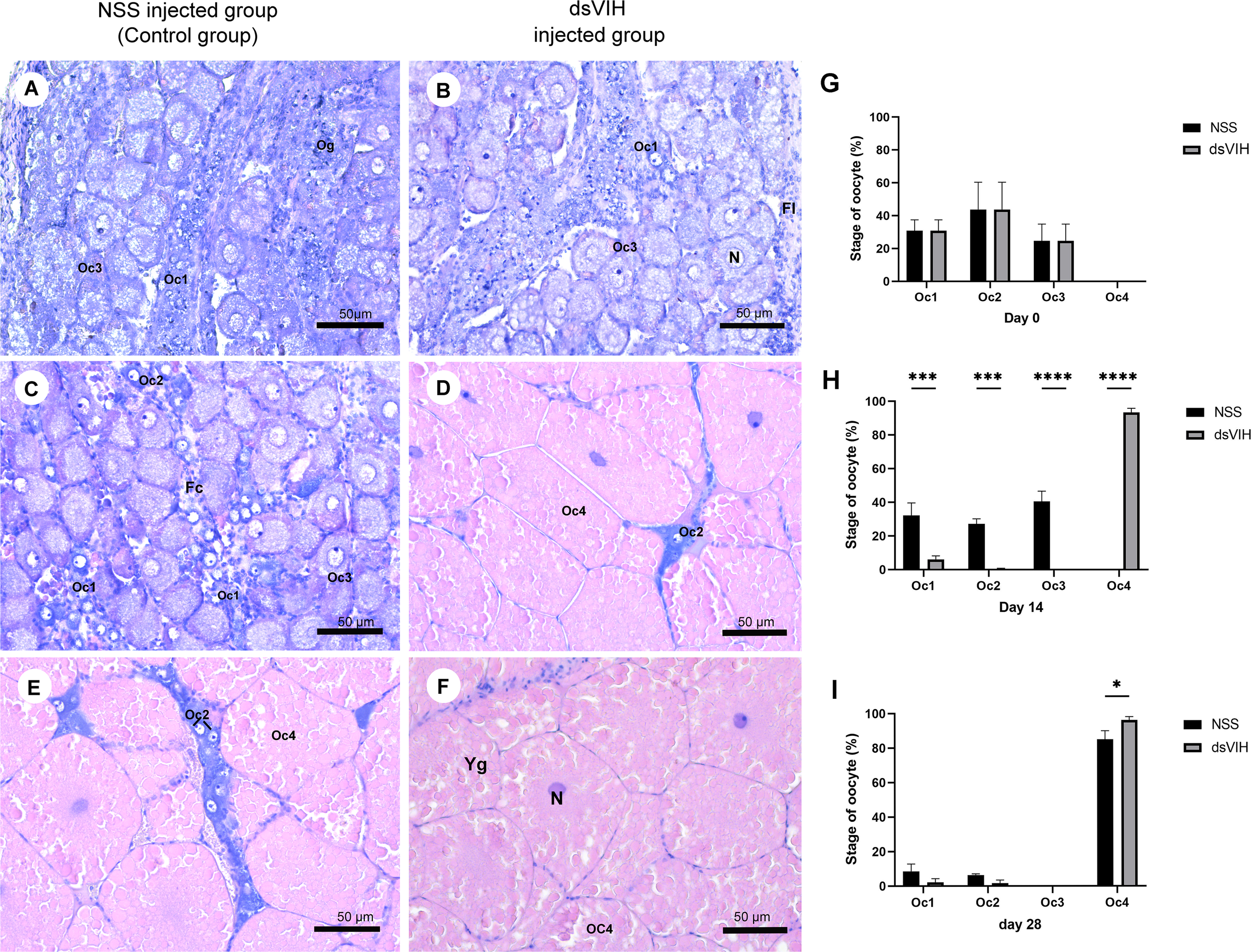 Histological analysis of the ovaries of dsRNA-VIH and NSS treated crabs. A representative sample from each group is shown. (A, B) At day 0, ovaries in both group showed oogonia (Og) and three steps of oocyte (Oc1-Oc3) (C, D) At day 14, NSS injected group and dsRNA-VIH injected group showed Oc1 that clearly displayed euchromatic nucleus, Oc2 that was oval and was surrounded by follicular cells, Oc3 that was oval and it contained mostly euchromatin and prominent nucleolus with small lipid droplets in cytoplasm, and Oc4 that was fully mature oocyte with large spherical ovoid shape and heavy lipid droplets in cytoplasm. (E, F) At day 28, the dsRNA-VIH injected group showed more Oc4 than that of the NSS injected group while the latter also showed some pre-mature stage (Oc1-Oc2). (G–I) Quantification of the oocyte stage on day 0, 14 and 28. Asterisks indicate significant differences compared to the NSS injected group and dsRNA-VIH injected group with *p < 0.05, ***p < 0.001, ****p < 0.0001. Oocyte developmental features are indicated as Yg, yolk granule oocyte; Oc, oocyte, Og, oogania; Fc, foccicle cell; N, nucleus.