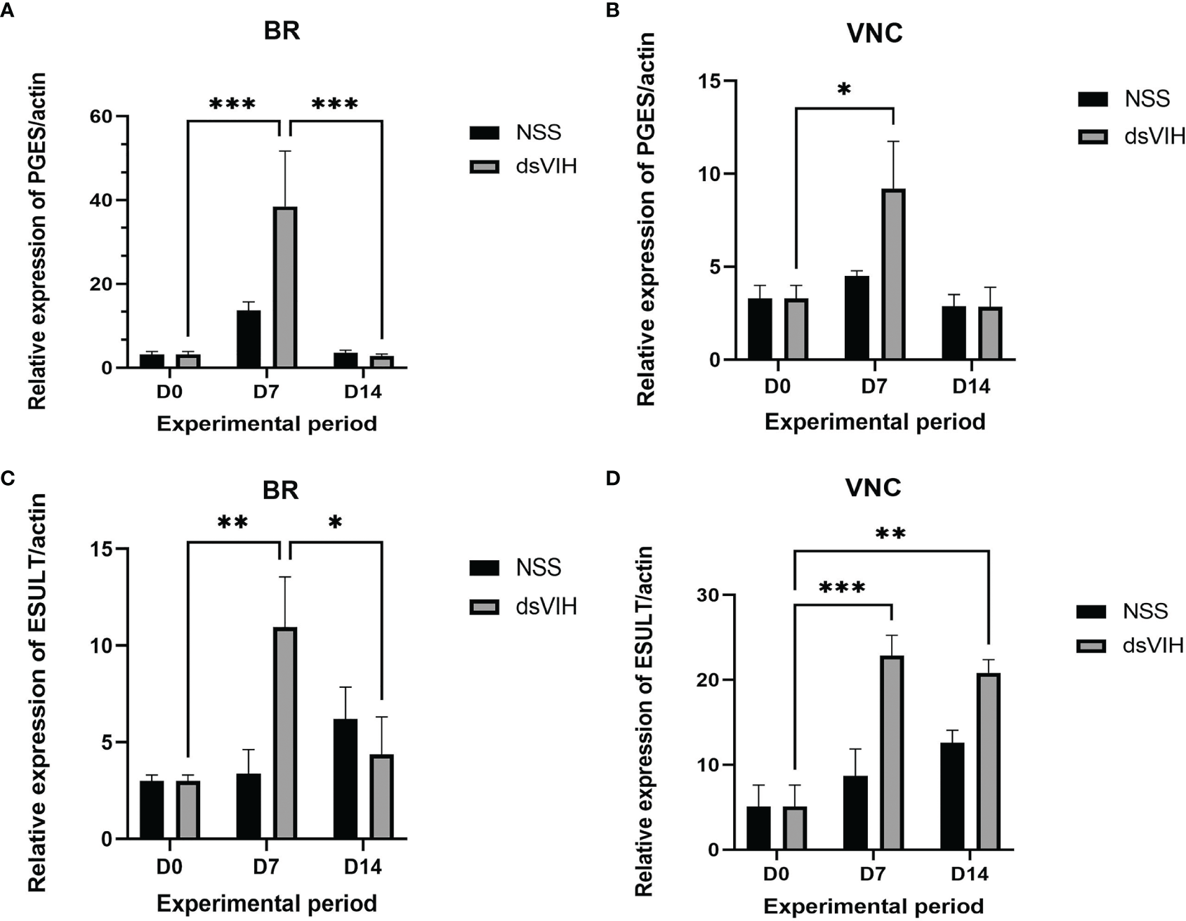 Effect of dsRNA-VIH on the Scyol-PGES and Scyol-ESULT transcript abundances using quantitative RT-PCR. (A, B) The histograms showed the level of Scyol-PGES which significantly expressed higher in brain and VNC after dsRNA-VIH administration for 7 days. (C, D) The histograms showed the level of Scyol-ESULT which significantly expressed higher in brain and VNC after dsRNA-VIH administration for 7 and 14 days. BR, brain; VNC, ventral nerve cord. Bars represent the standard error of the mean (SEM). *p < 0.05, **p < 0.005 and ***p < 0.0005.