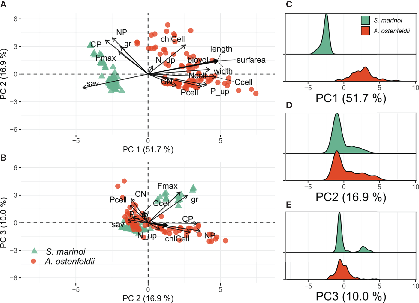 Results of PCA for two species. Ordination plots summarizing traits variation of A. ostenfeldii and S. marinoi strains (A, B). Density plots of individual loadings grouped by species (C–E). Traits abbreviations as in Table 1.