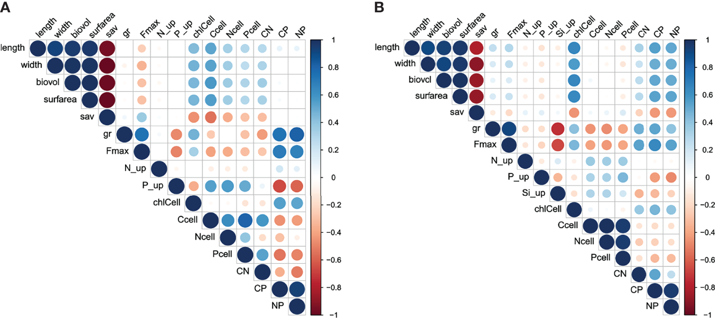 Correlation matrix of the different traits measured from different (A)A. ostenfeldii and (B)S. marinoi strains grown under different salinity conditions.