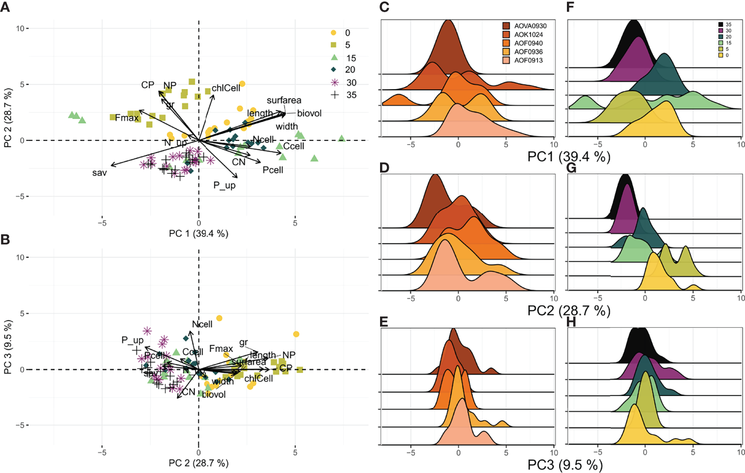 Results of PCA for A. ostenfeldii strains grown under six salinity levels. (A, B) Ordination plots summarizing the variation of traits in all experimental units. (C–E) Individual loading grouped by strain along the first three principal component axes. (F–H) Individual loading grouped by salinity along the first three principal component axes. Traits abbreviations as in Table 1.