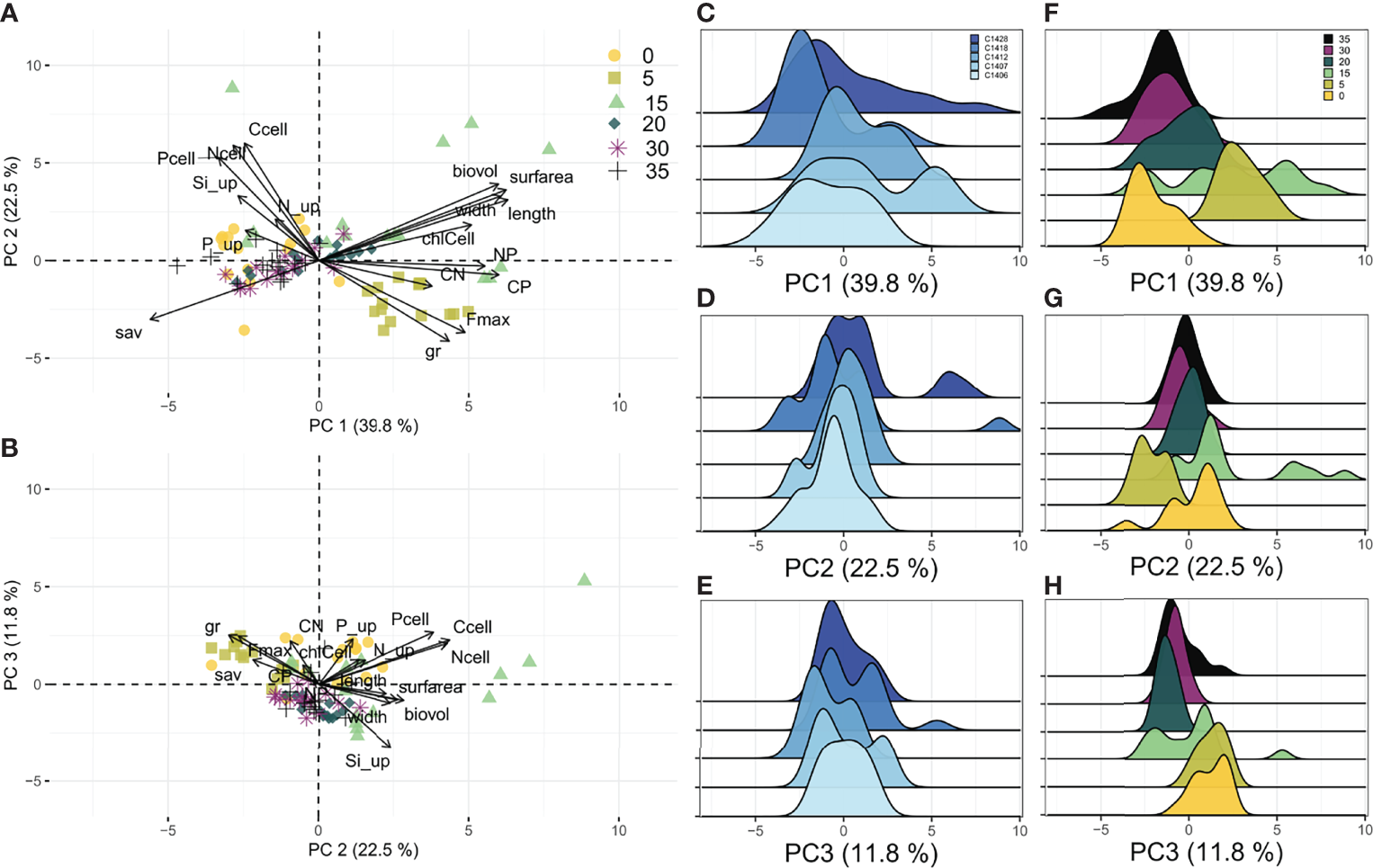 Results of PCA for S. marinoi strains grown under six salinity levels. (A, B) Ordination plots summarizing the variation of traits in all experimental units. (C–E) Individual loading grouped by strain along the first three principal component axes. (F–H) Individual loading grouped by salinity along the first three principal component axes. Traits abbreviations as in Table 1.