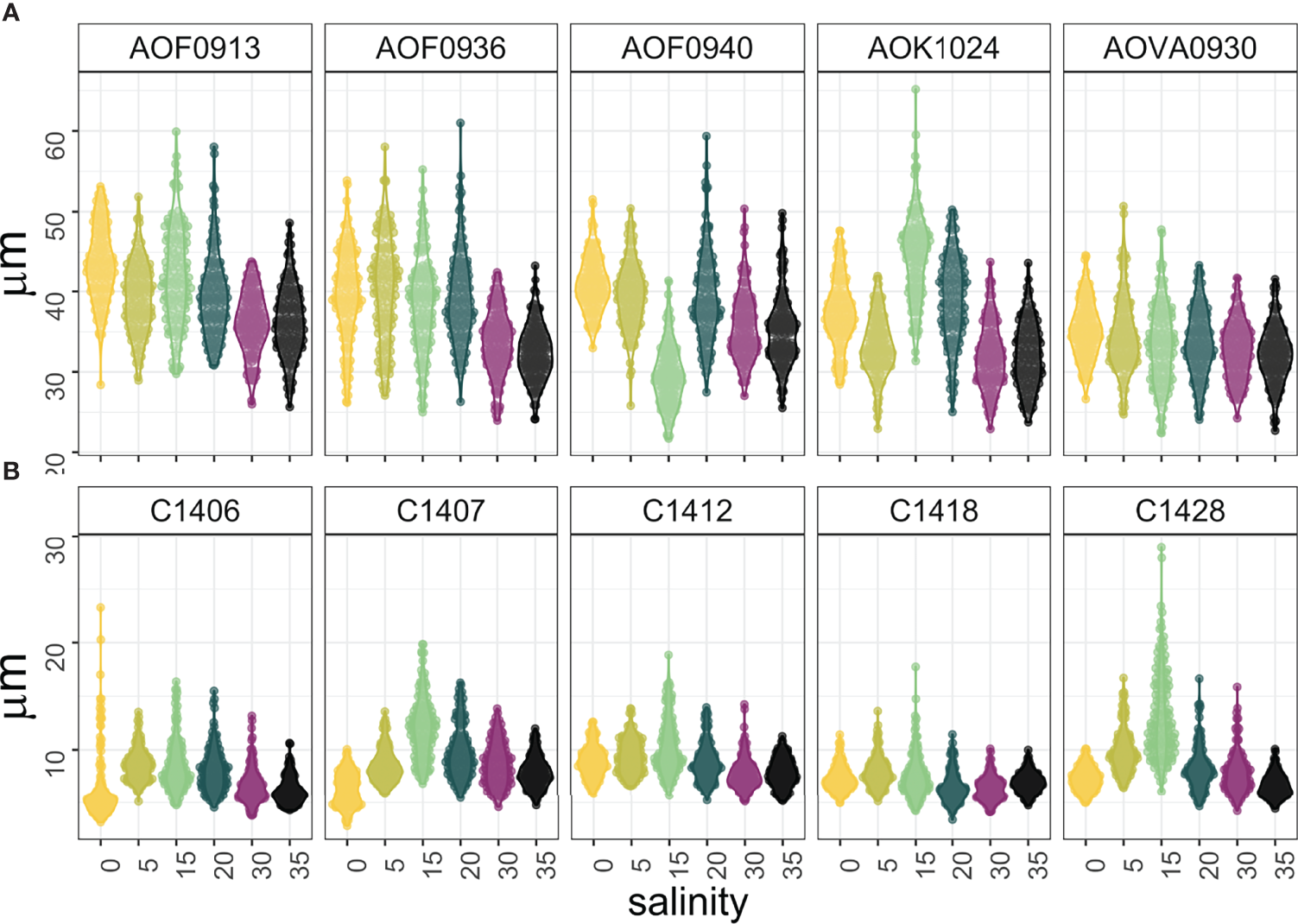 Cell length of (A)A. ostenfeldii and (B)S. marinoi strains along a salinity gradient (n = 150).