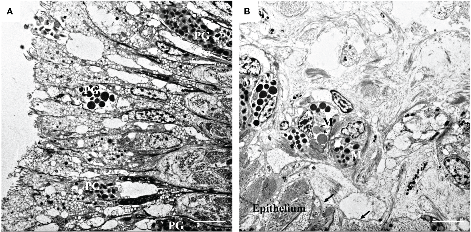 In this study, pigment particles were observed in the epidermis of the mantle tissue of C. gigas. It is generally believed that the amount of melanin in the epidermis determines the depth of skin color. This indicates that the amount of melanin in the mantle of C. gigas is closely related to the number of pigment particles in the mantle tissue. Similar results were found in the foot epithelium of abalone. The existence of melanocytes with high electron density particles in the deeper side of the foot epithelium was identified using ultrastructural analysis, but not in the light-colored sole foot epithelium (Bravo Portela et al., 2012). In normal human skin, a large amount of melanin exists in the basal layer of the epidermis and after UV stimulation melanin is transferred to the epidermal cells through a long process to prevent UV radiation (Nielsen et al., 2006). However, in this study, TEM results showed that the basal layer was not observed in the mantle tissues. Notably, pigment particles were found in the mantle epidermis and melanocytes were found below the basement membrane of the mantle tissues. It has been speculated that melanocytes secrete melanin to the epidermis by transferring melanin.