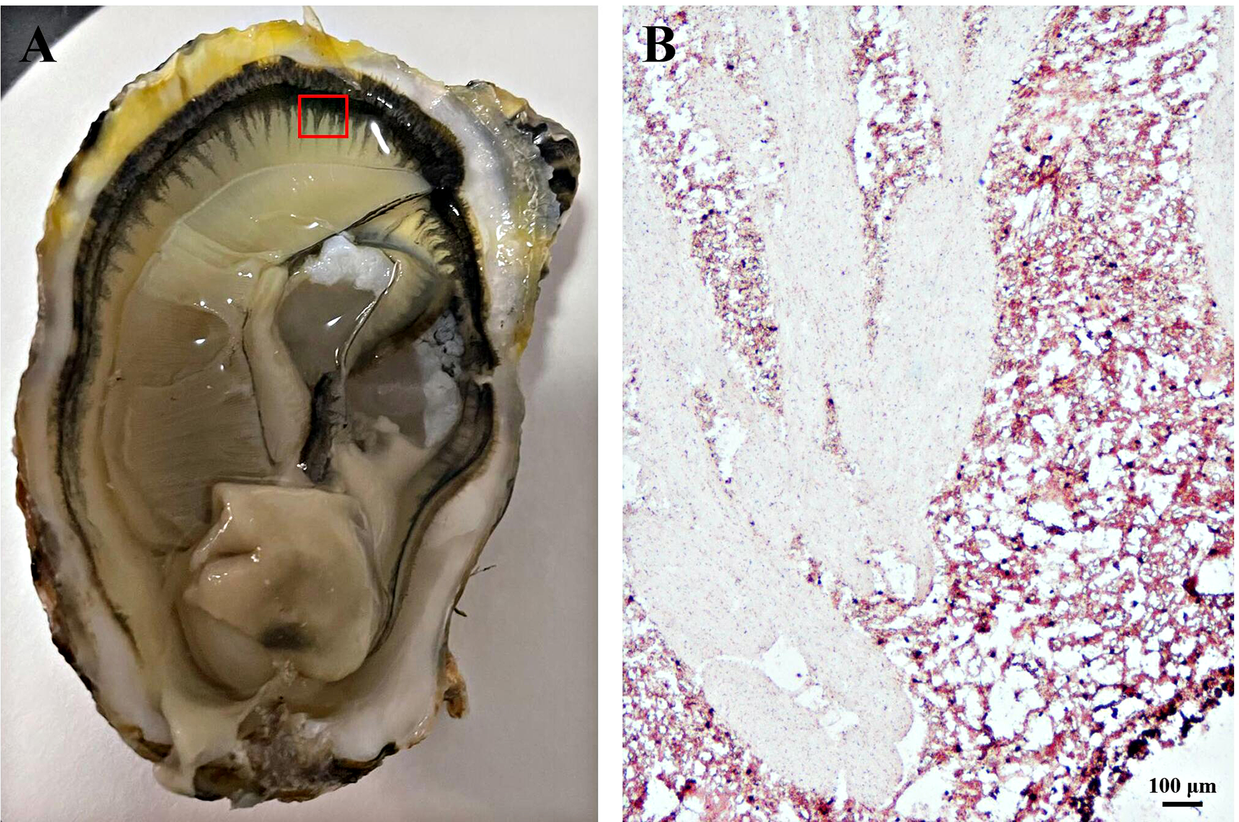 Crassostrea gigas is a globally distributed mollusk that has been well-studied in the fields of ecology, genetics, and biology. It is also a potential model organism for marine mollusks (Zhang et al., 2012; Yu et al., 2016). There are many studies on shell color in C. gigas (Ge et al., 2015; Xu et al., 2017; Han and Li, 2021). The mantle, located near the shell surface, is a key organ for shell formation (Ivanina et al., 2017). The mollusk mantle can secrete organic matrix components responsible for controlling shell formation (McDougall and Degnan, 2018). Proteomic data also show that a variety of proteins related to shell formation are expressed in the mantle (Zhang and Zhang, 2006; Marin et al., 2007; Kocot et al., 2016). A study revealed the positive correlation between pigmentation at the edge of the mantle and shell color in C. gigas (Brake et al., 2004). After several generations of genetic breeding, there is a high probability of pigmentation on the edge of the mantle of C. gigas that is consistent with the occurrence of the black shell (Kang et al., 2013). Therefore, the mantle may be an important factor affecting the shell color. Although, the black mantle of C. gigas is more popular than it once was (Nell, 2001; Kang et al., 2013), the precise mechanism of melanin formation, and evidence of the relationship between melanin and shell color are unknown. Studies show that tyrosinase is important in the synthesis of oyster melanin, and the promotion of shell growth and pigmentation (Yu et al., 2014; Feng et al., 2019; Zhu et al., 2021). However, the location of melanin and the biological process of melanin formation in the mantle tissue of oysters are still unclear.